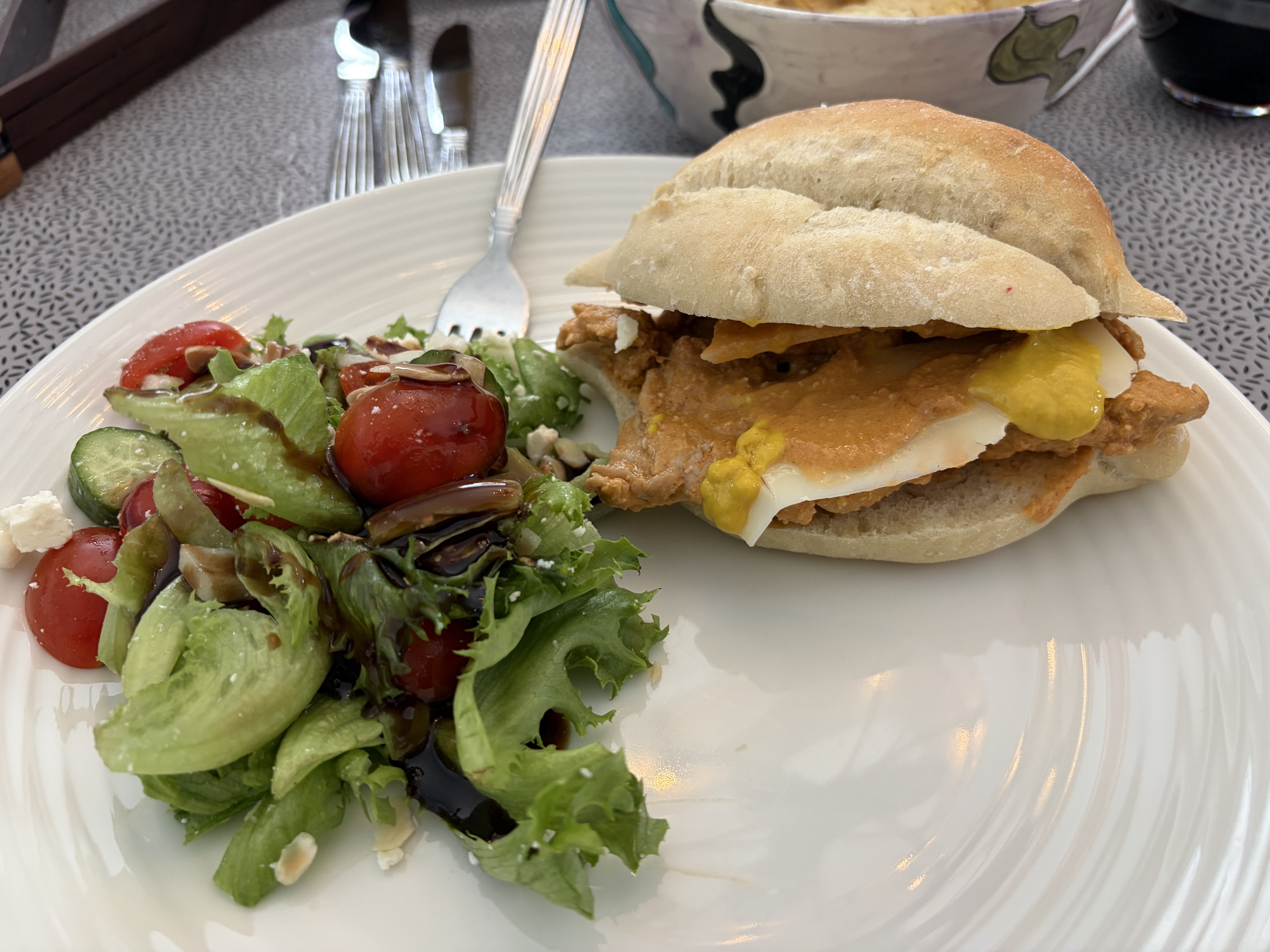 Blooming onion appetizer, then bifanas with salad, and apricot cake and vanilla ice cream