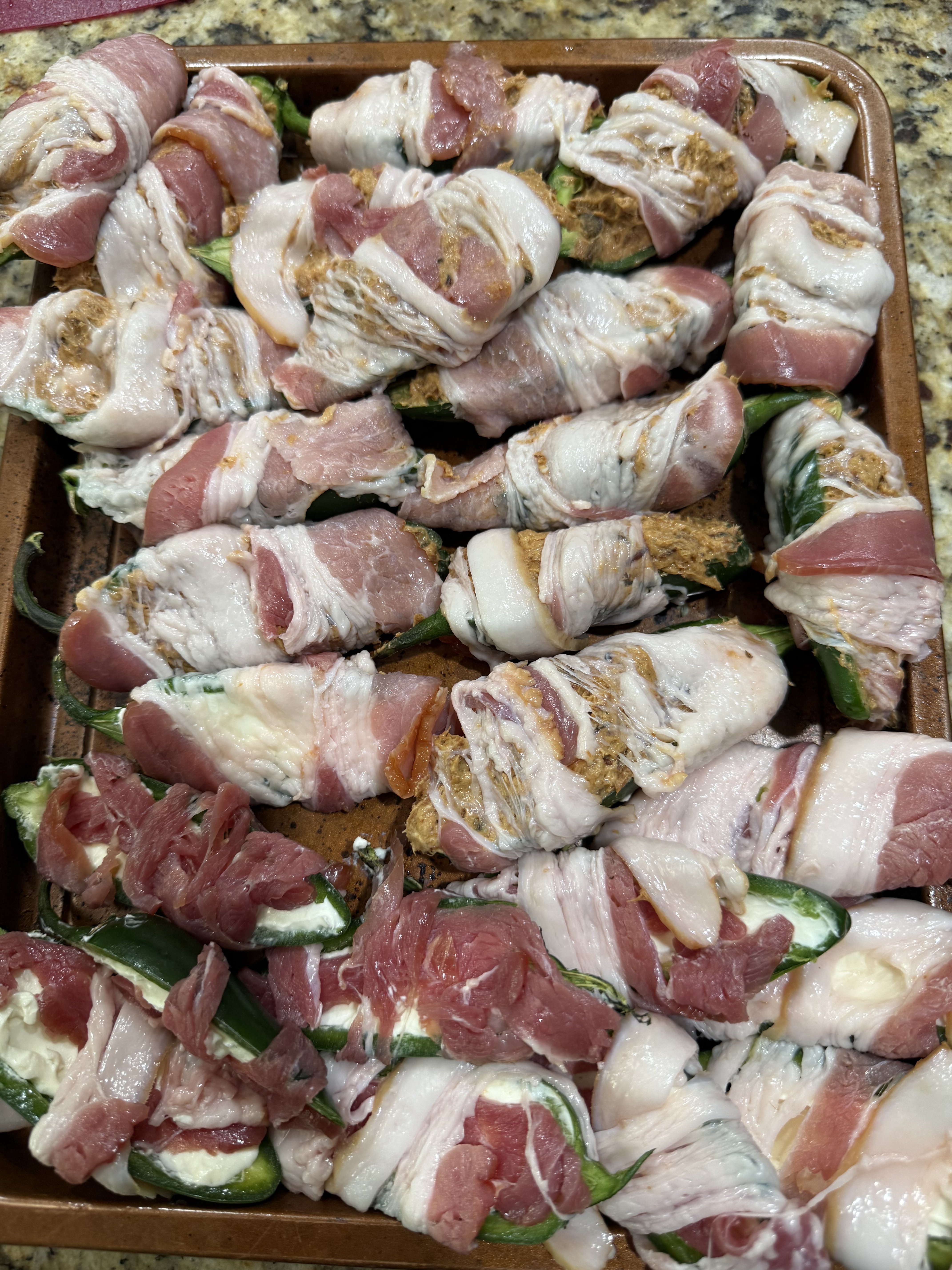 River Griller,[p]I follow the basic recipe Egret posted, but I leave out the cocktail sausage (healthier right?) and add 1 tsp of Raging River rub per 1/3 cup of the cream cheese. I let it melt into the cheese and add it to a plastic sadwich bag so it's easy to fill the peppers. I parboil my bacon for about 2 minutes so it cooks faster. I also make them "on the 1/2 shell" and use 1/2 a bacon strip per turd. (That reads funny.) I sprinkle Red Eye express on the outside. When they are nearly done, sometimes I put a little pepper jelly glaze on them.