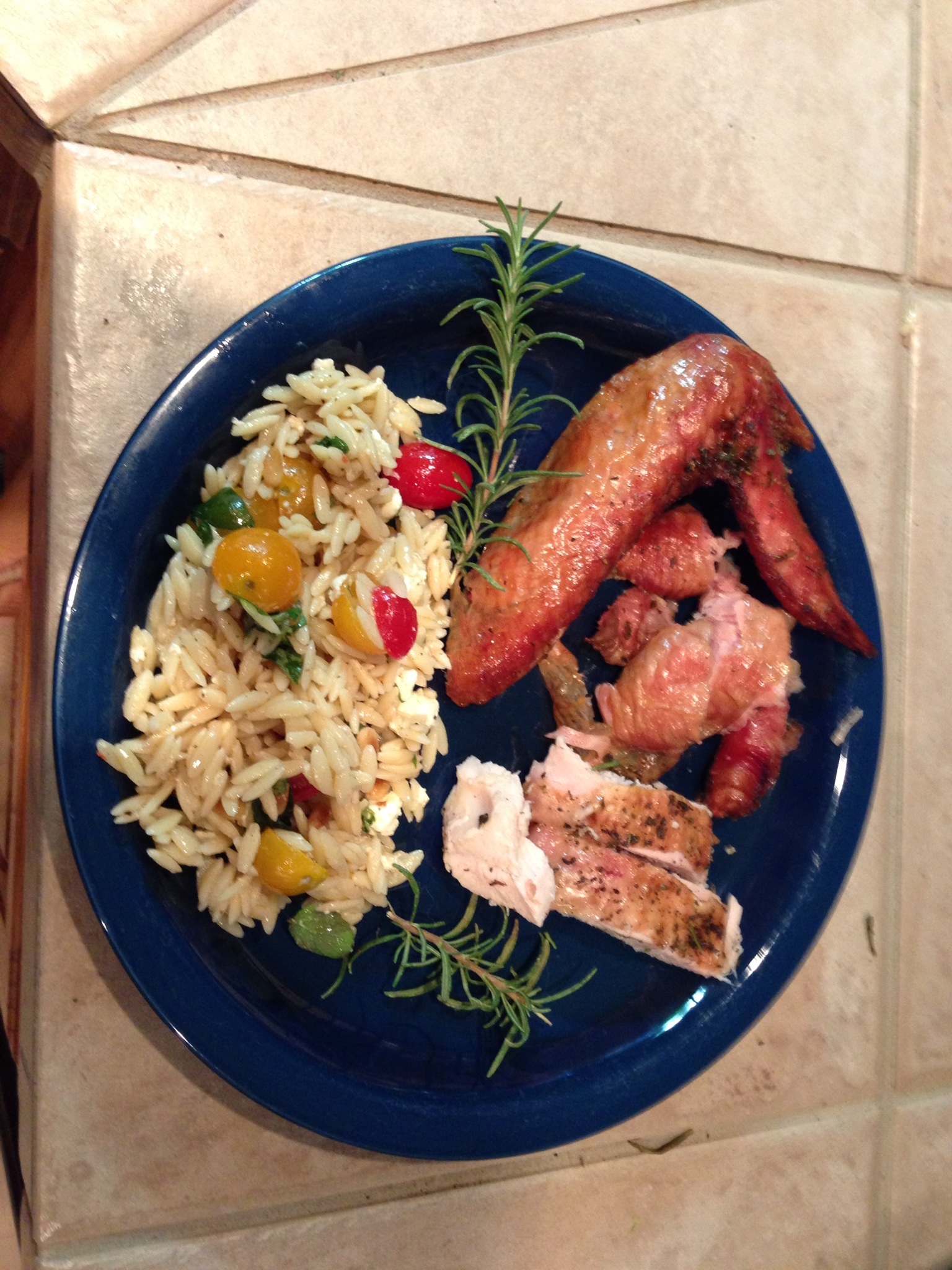 Turkey and orzo salad, kept it simple. Had a sparkling cider (we're expecting, so no champaign this year...or at least not rubbing it wife's face at Christmas)LBGE & SBGE. Central Texas.