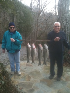 O.K. Here are pics of the stripers. Got to the lakehouse on 12-26 and fished every morning for a week in temps in the low 30's. Caught fat stripers all week. Boat is covered with propane heater so we were comfy. I grilled them, fried them and gave some to neighbors. (I'm the platinum blond on the right).