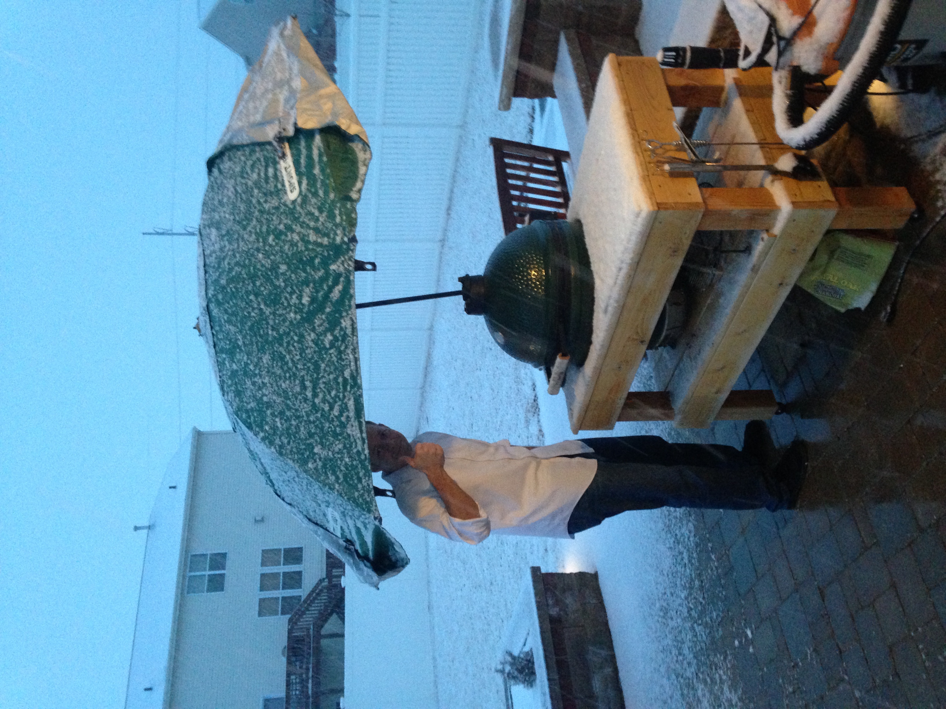 It was sunny all day, and just before dinner time, gigantic snowflakes started falling. My wife suggested we order pizza, but I went to the garage and came back with a workaround. 1.5" PVC, and a huge umbrella. I jammed the pipe into the mulch, slid the umbrella in and was in business.