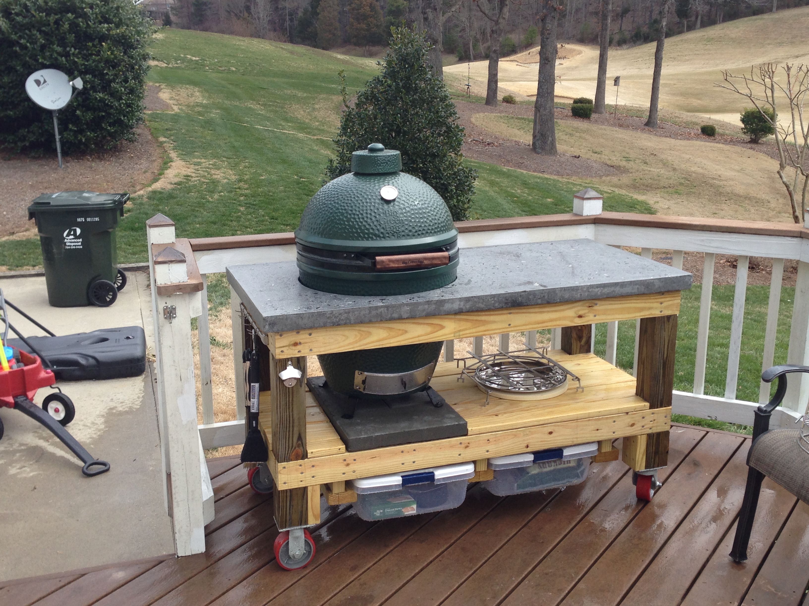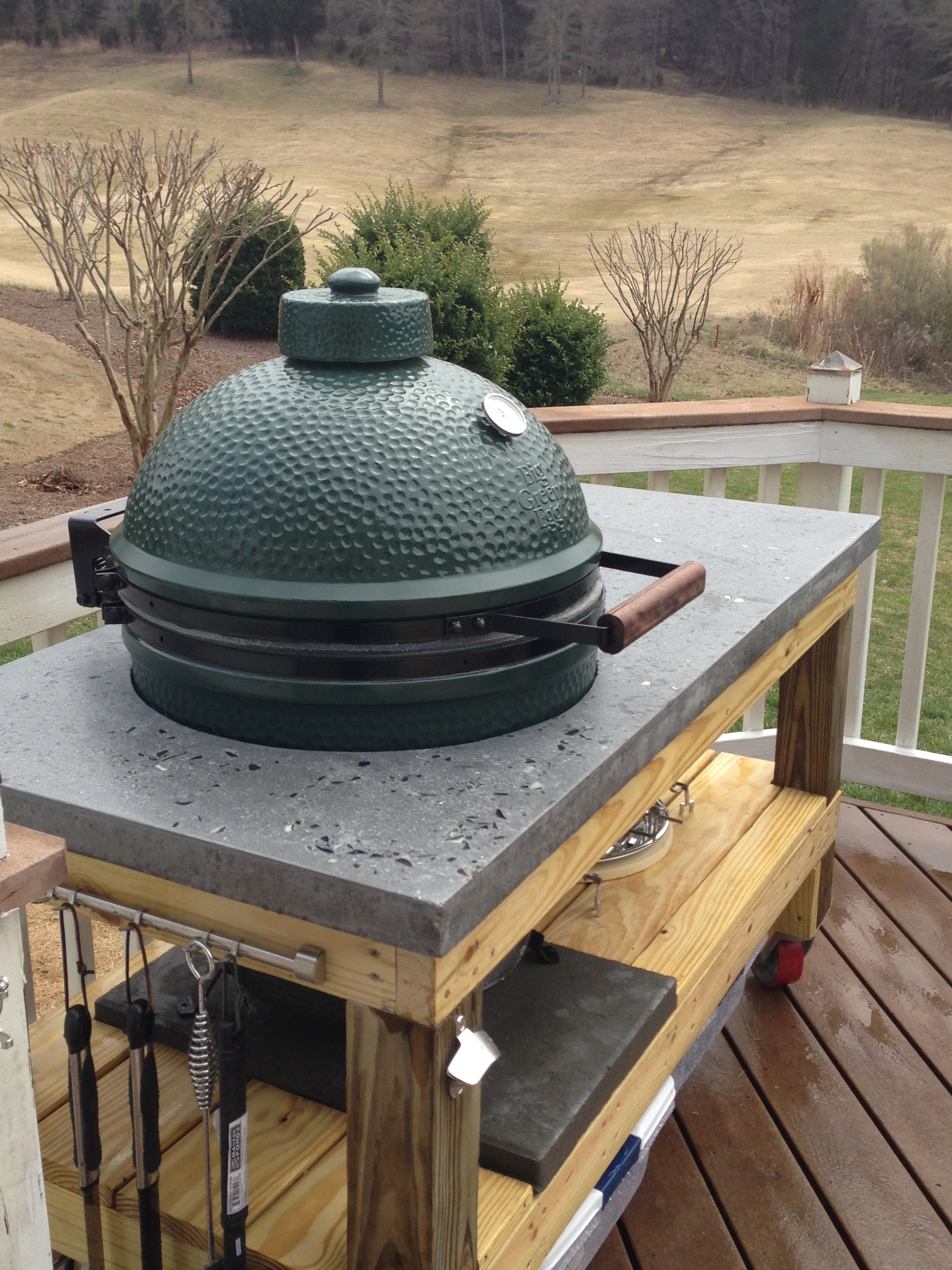 @RAC--Yes, I did the table top myself. Followed Cheng's guidelines. Used Quikrete Concrete Mix. There were a few projects here that I mimiced mine after. Amazing how much information there was on the internet. It really wasnt that hard, and was fairly reasonable. I'd say I have about $130 in the top including concrete, reinforcement, sealer, mold supplies, etc. I wanted something I could set something out of the egg onto without worrying about a fire, burn mark, or staining from ash/sauce. Not perfect, but I like it.