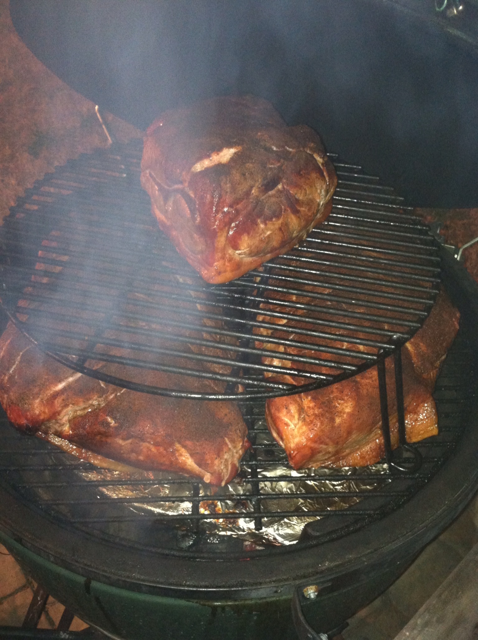 Granny. If you need to cook that much again. Find the whole shoulders. I like them better than butts. But I can only get them in 80 lb boxes here, so I leave them for large cooks. With the second grate I can get three shoulders on. App 60 lbs.