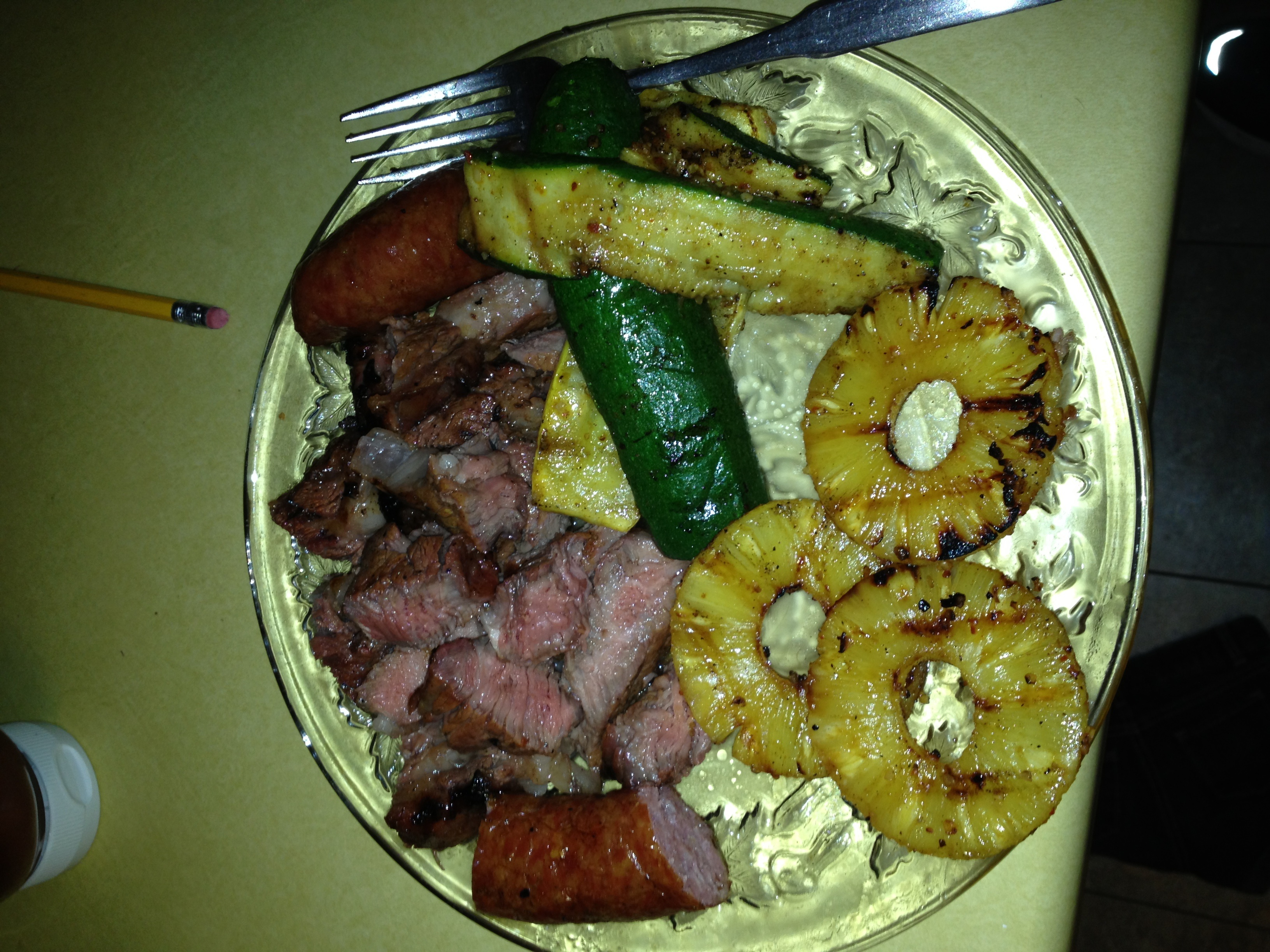 My first shot at these but definitely not my last. They were oh so good. Grilled yellow squash. Zucchini, and pineapples for the sides. Oh yeah some polish sausage as well.