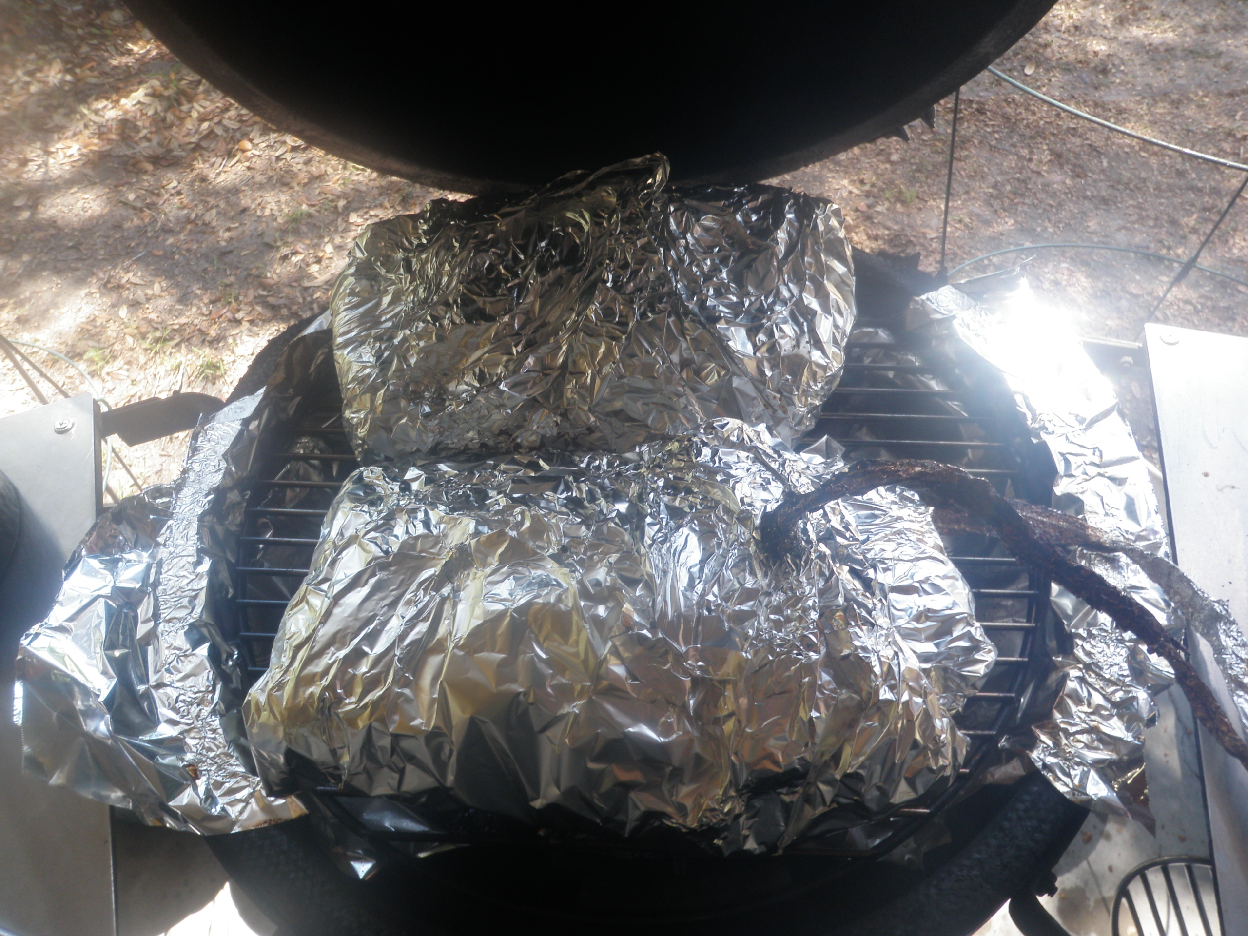 Two and a half hours into the smoke part of the turbo and the grid temperature has crept up to 234 (over the setpoint of 215) and the internal butt temperature is 132 heading for a pulling temperature of 160 degrees. Been off to the store for two hours -- thats what is nice about the turbo cooking!! Now, after i hit 160 internal, i will wrap them in a few layers of foil, place them back on the grill and bump the grid temperature up to 330. Then cut the grass. Should take about three hours to hit the pulling temperature of 210 degrees since it is injected....