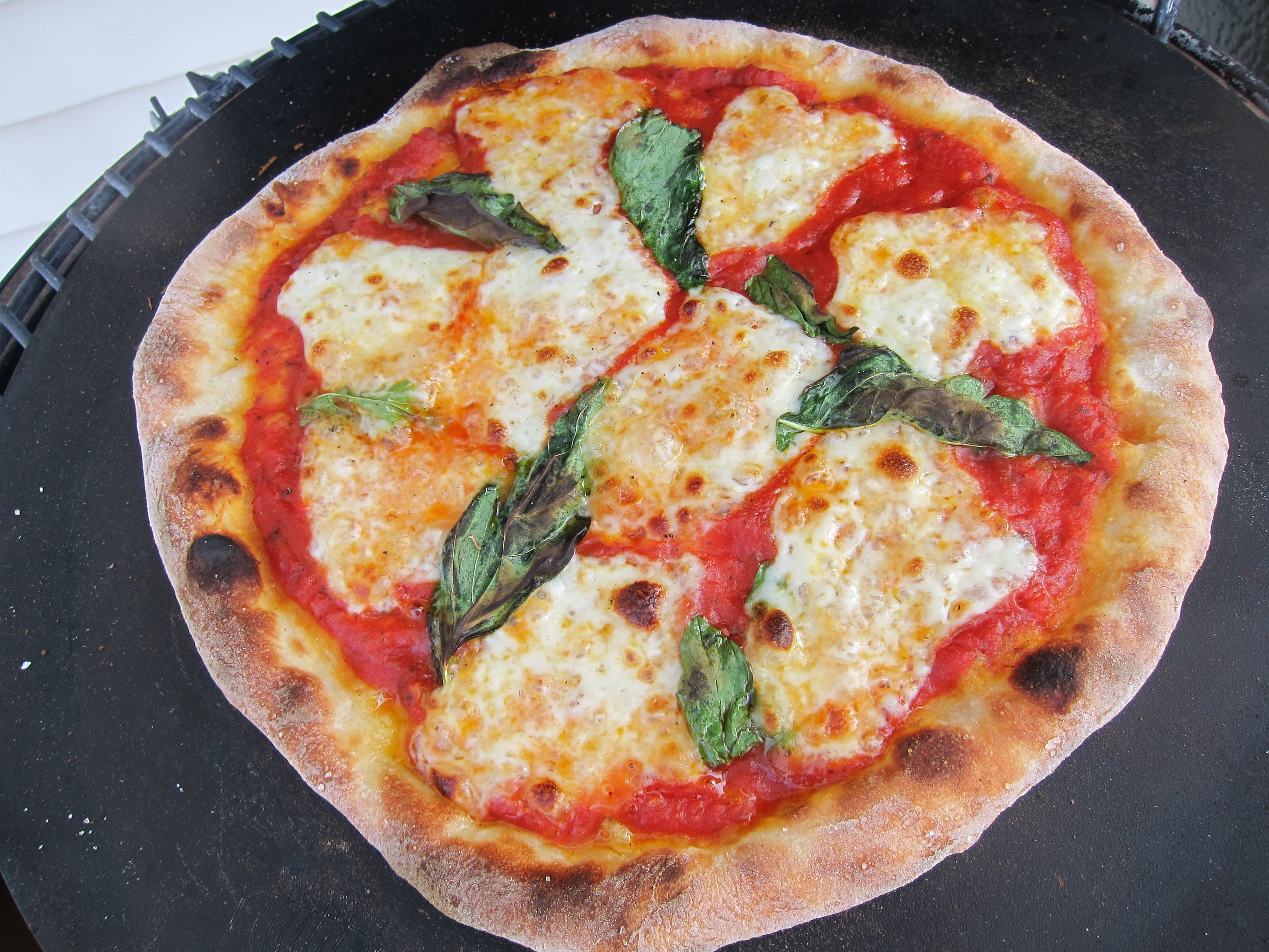 A simple Neopolitan dough minus the oil and sugar, fresh basil, San Marzano tomatoes, whole milk mozz, and a hot egg.