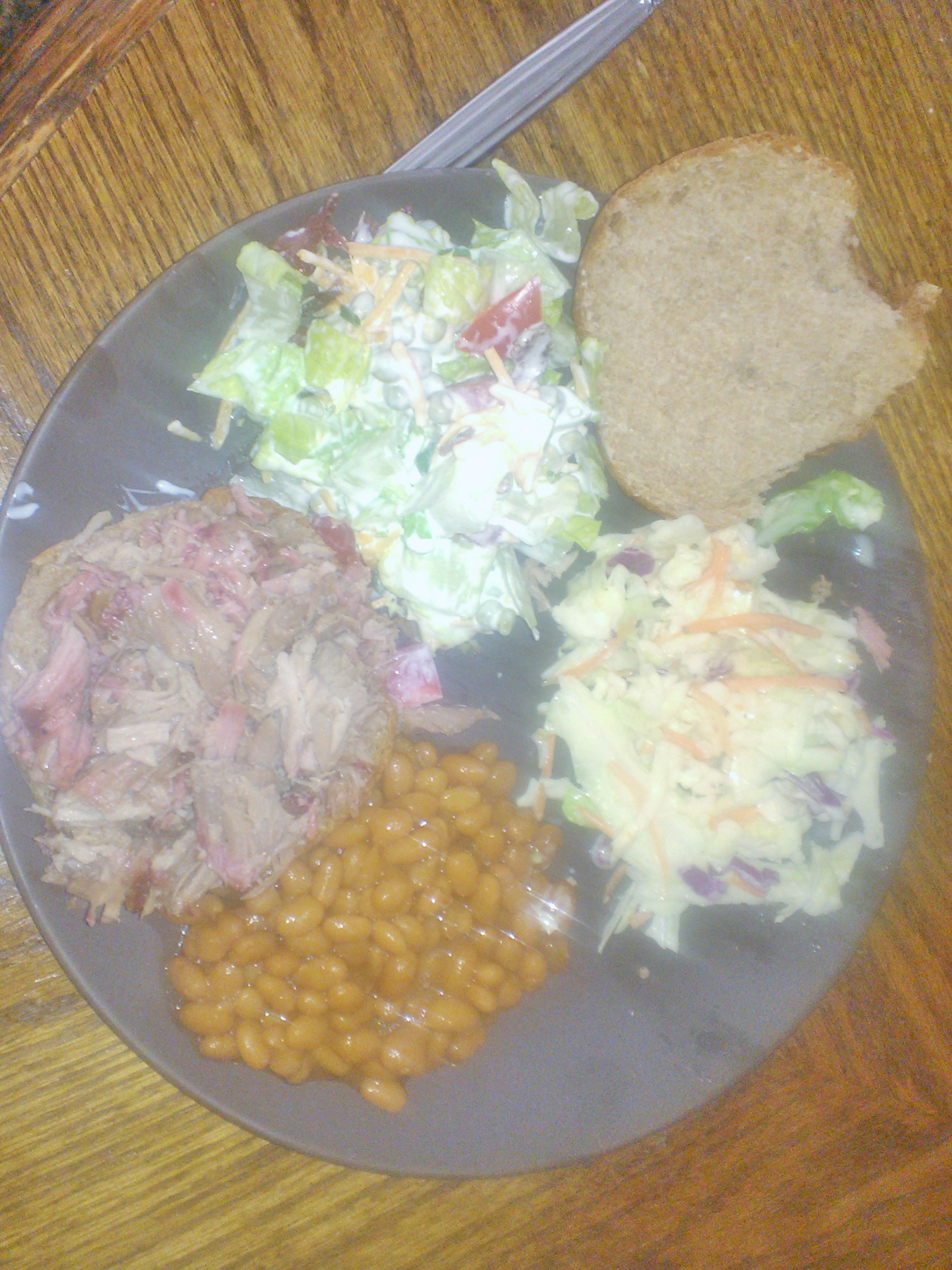 The pork, the sides (layered salad and slaw from a Dillard House Recipe) and finally the plated - sorry photo wasn't so great and I was ready to eat.