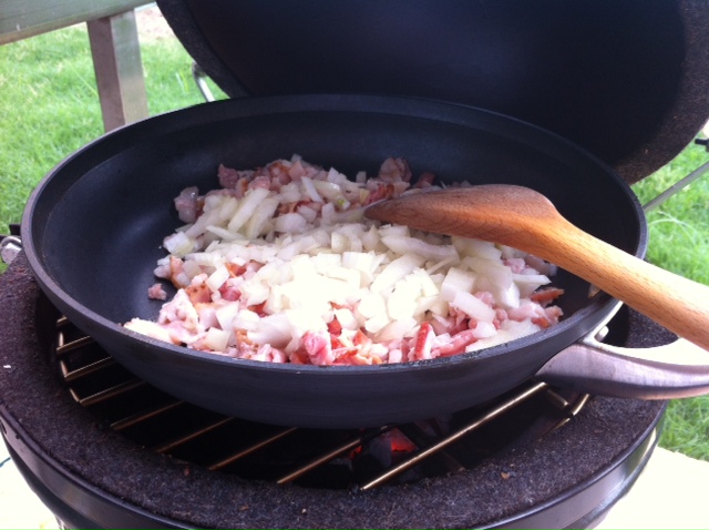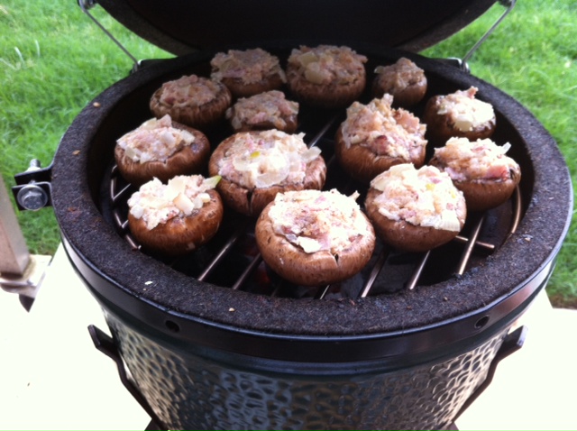 So, we cut the stem that was removed from the baby bella into small pieces to add to the stuffing. Then, I took the bacon and onions and sauteed it on the egg with cream cheese. Once done, mixed it up with bread crumb, slight bourbon, grated parmesan and the "cut up stem pieces." I then sprinkled the stuffing with Dizzy Dust instead of salt and pepper. After stuffing it into the mushrooms, I put it back in the egg for direct grill approx. 7-9 minutes for each batch.