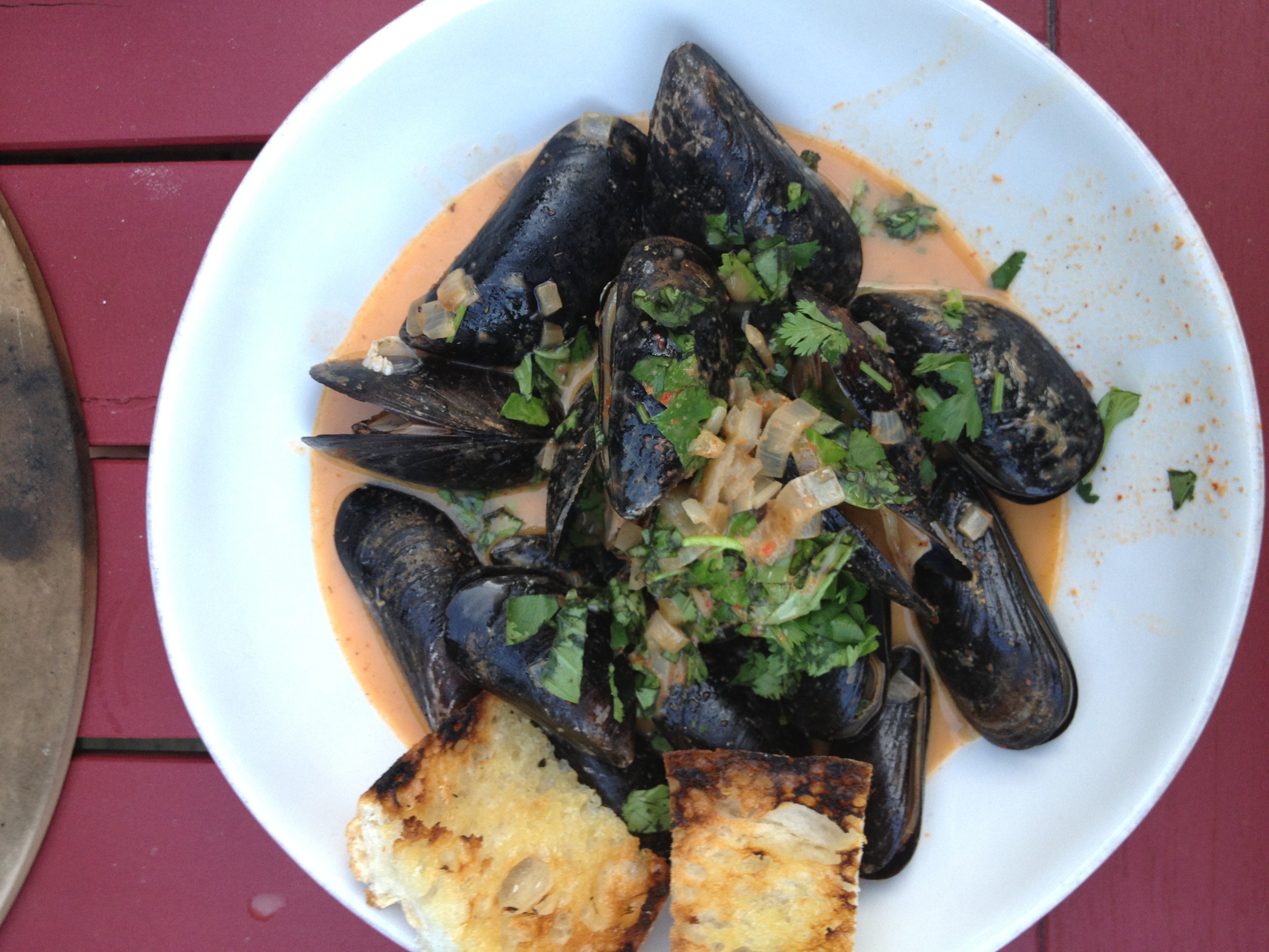 In celebration of 2 years I blissful marriage, my husband cooked me dinner on the egg tonight. An appetizer of seared scallop on a homemade crostini with arugula and lemon olive oil and Thai mussels with grilled bread. He's awesome and so was the meal.
