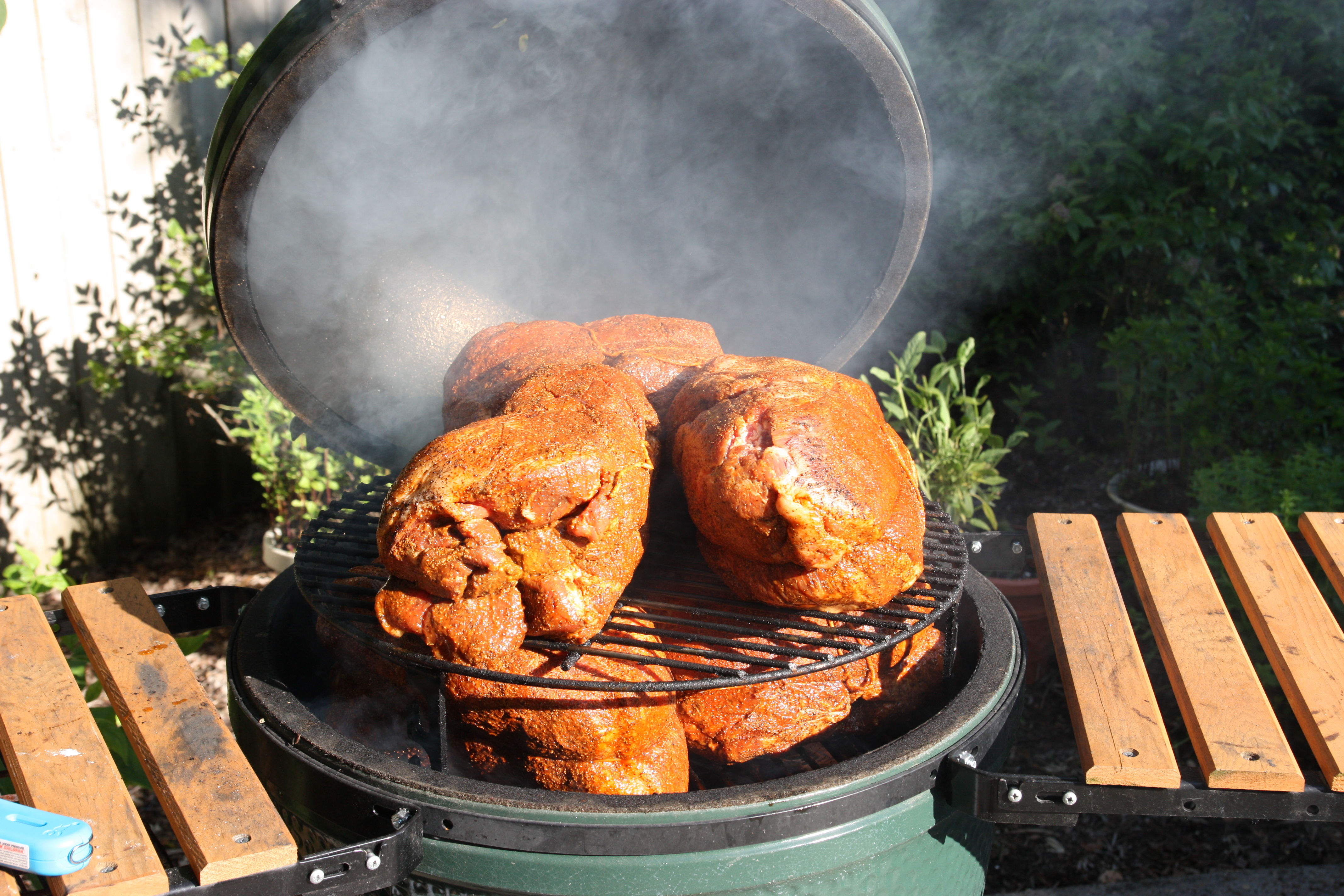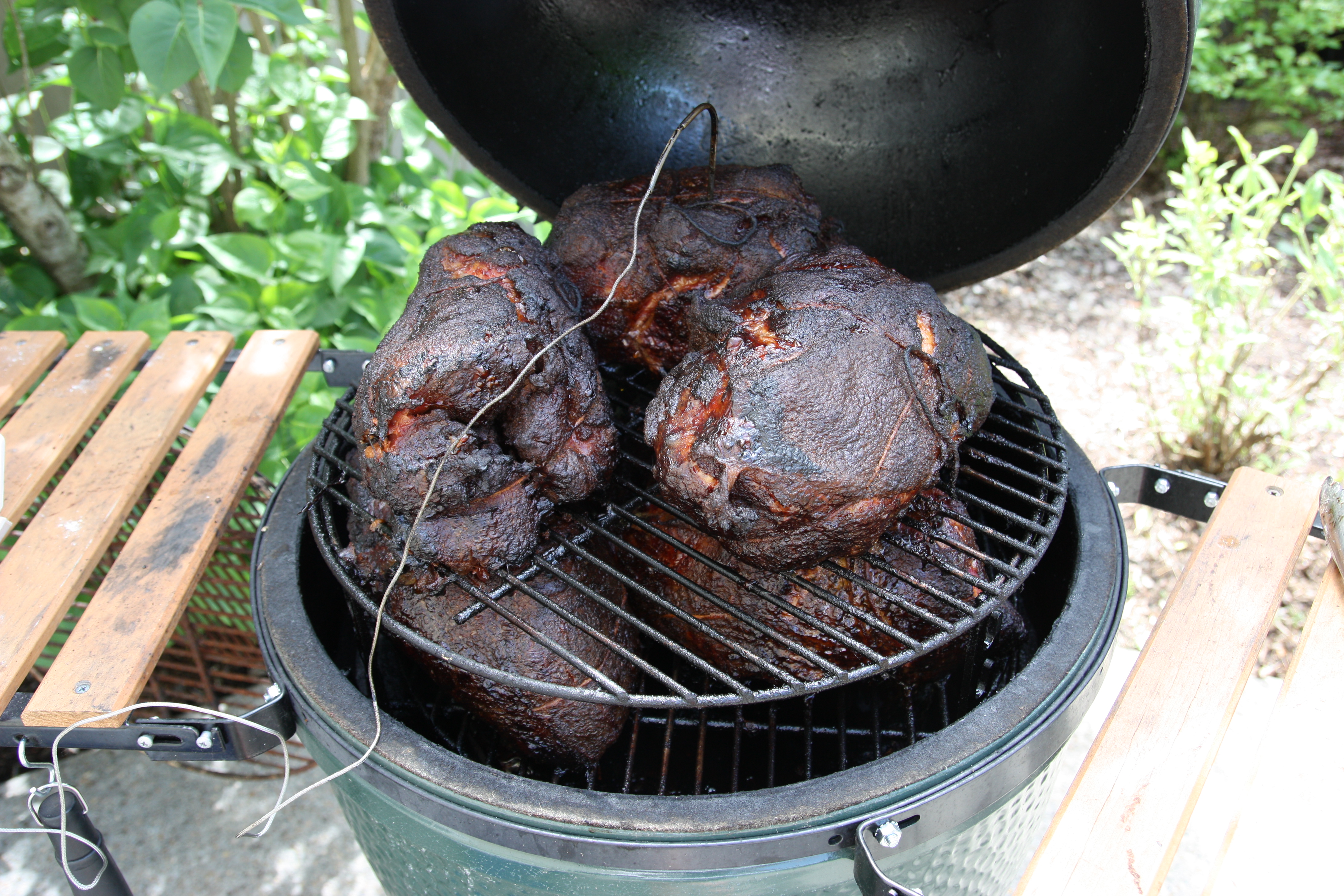 Here's a photo of Celtic Wolf doing 6 butts on a large Egg for the troops. As I remember it, he had 3 larges cooking 18 butts, and 3 larges cooking 6 whole packer briskets. Lots of meat.....