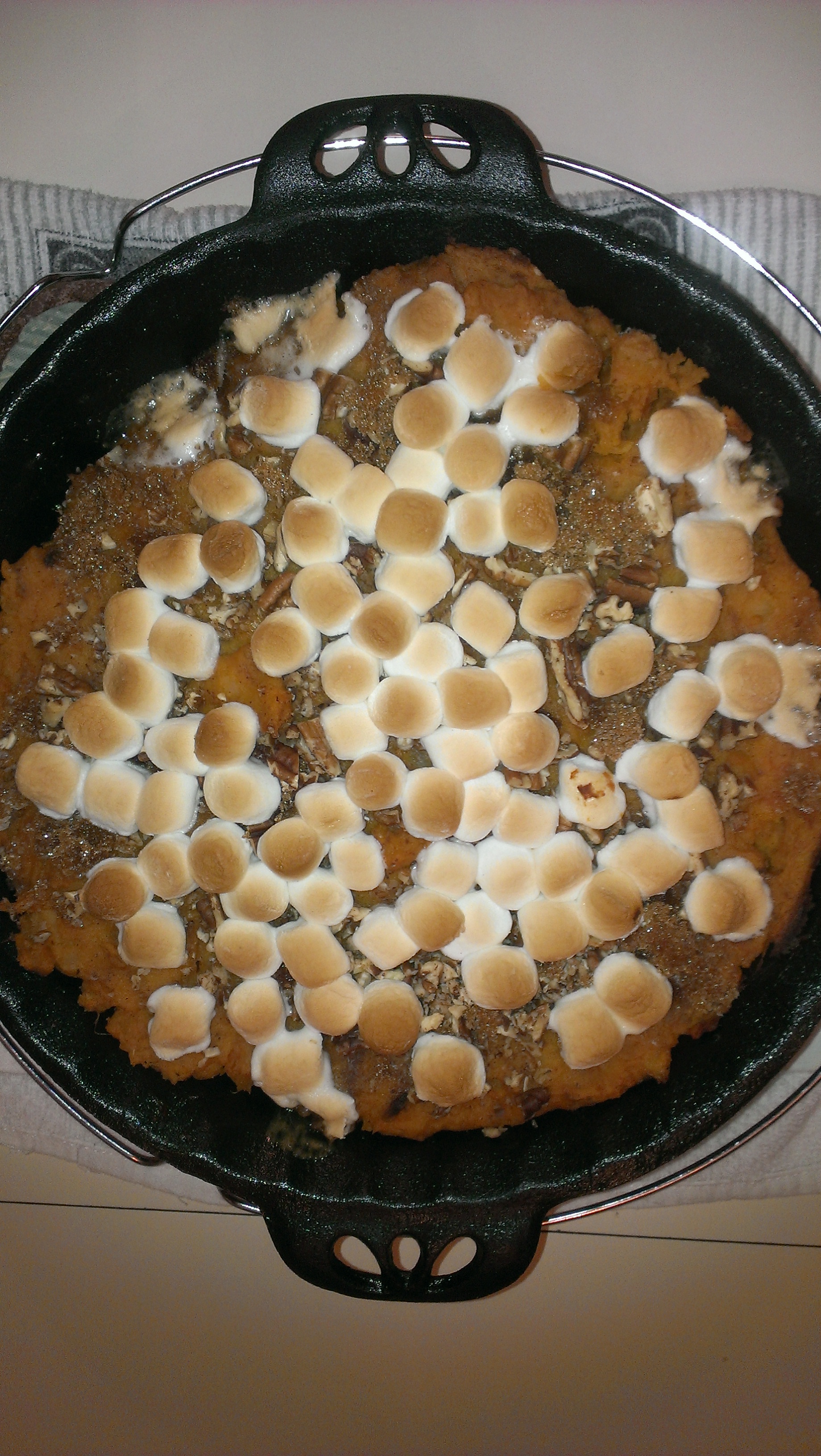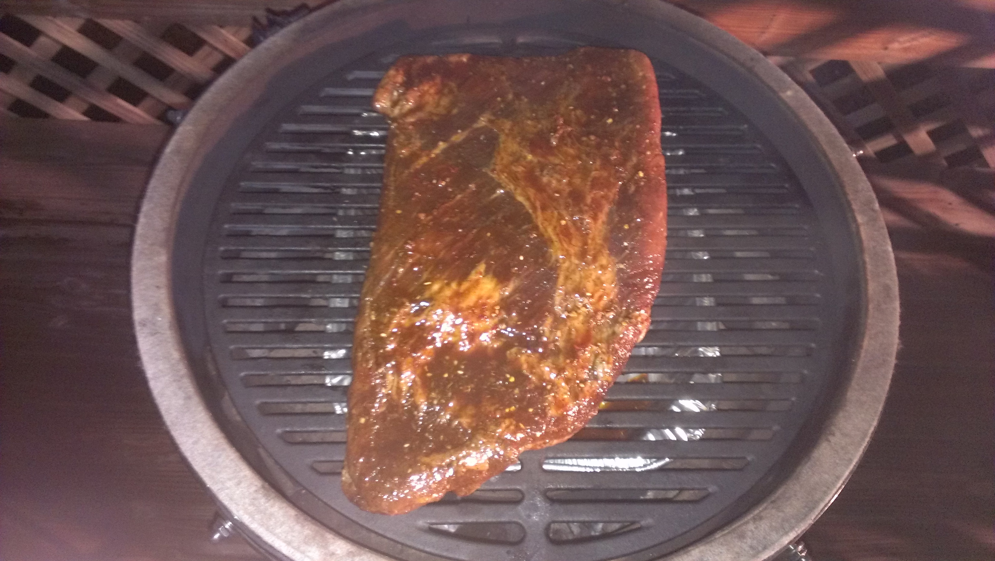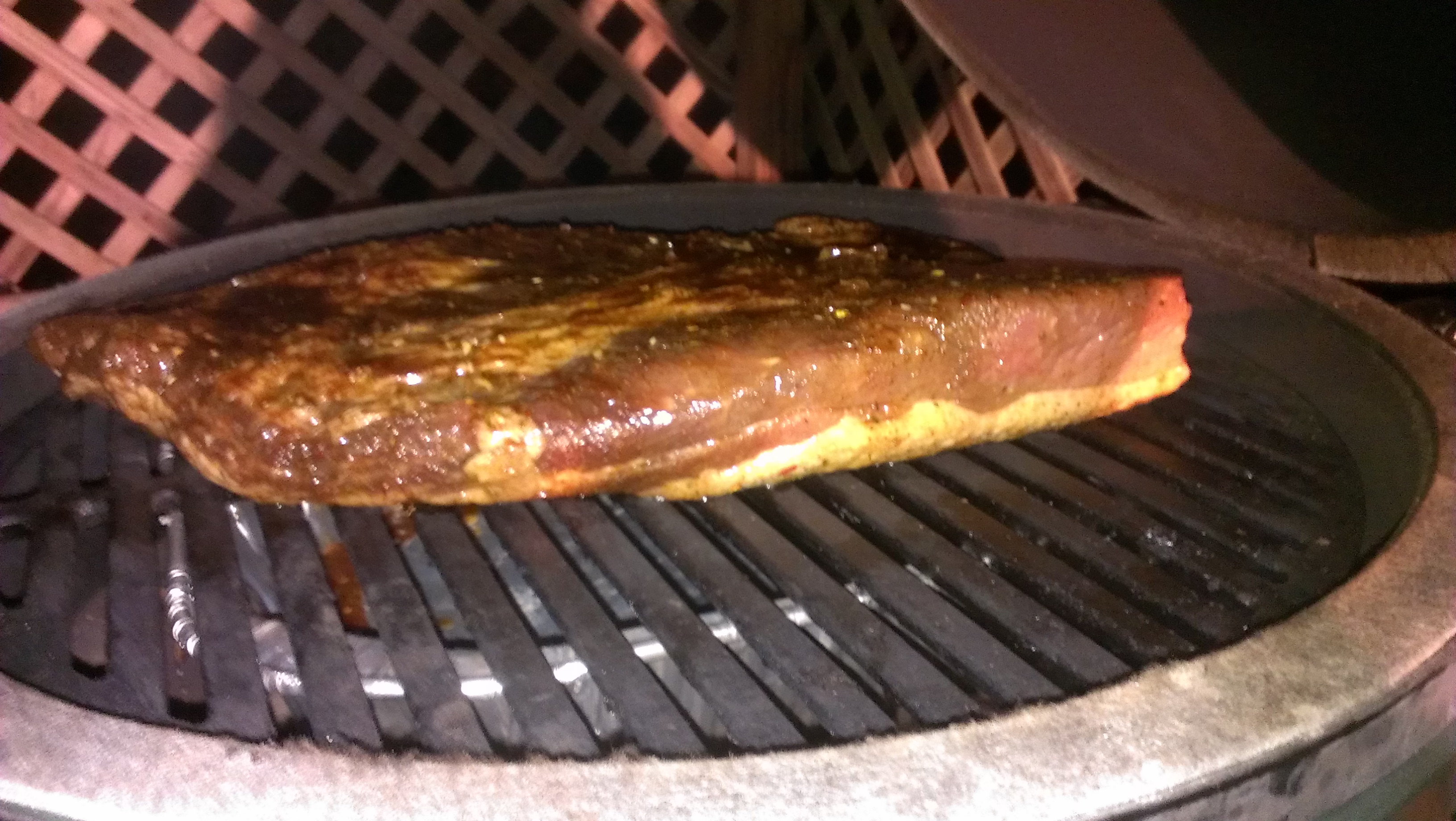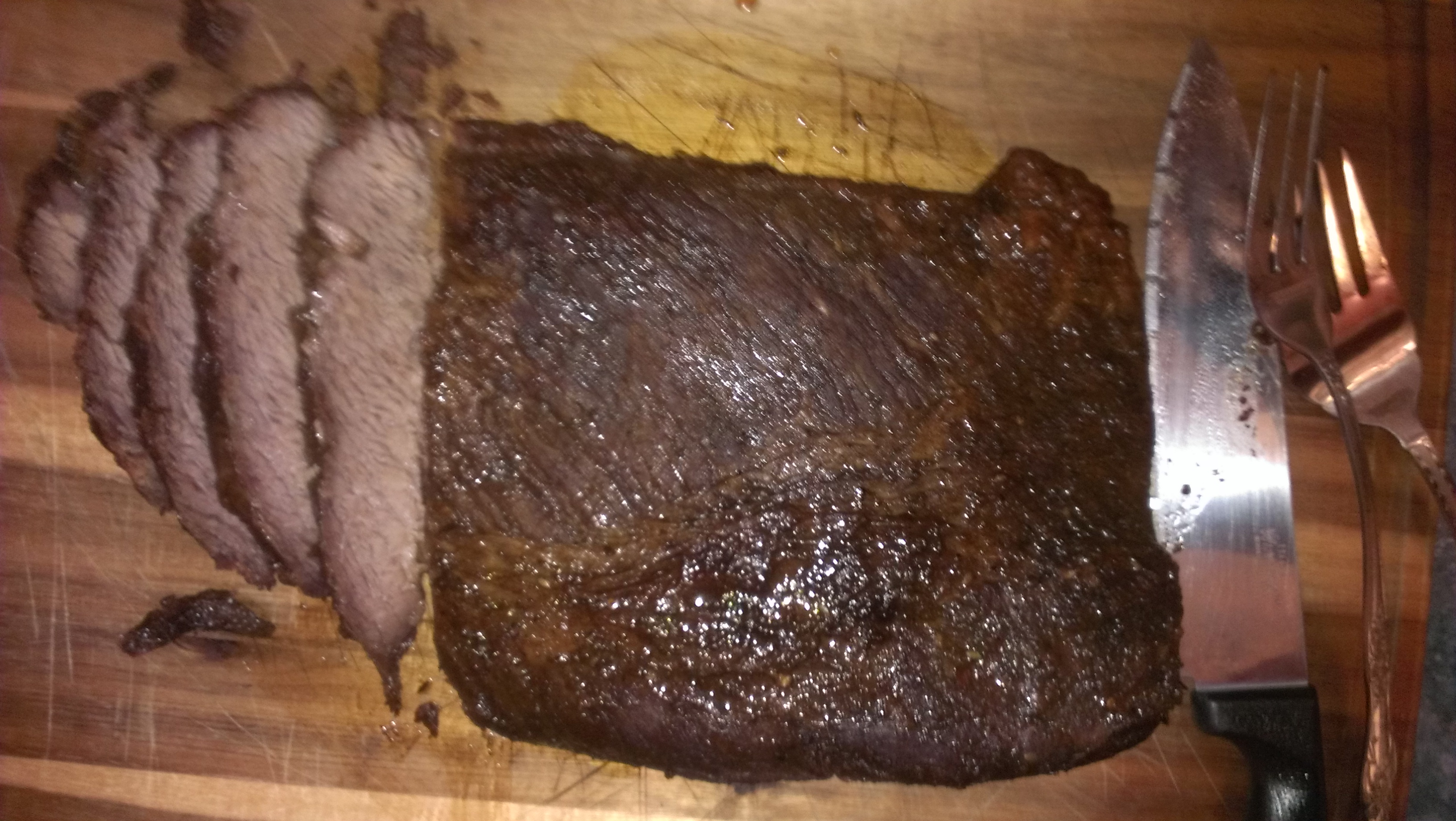 #8 Flat...prep>injected w/ apple juice, rubbed w/ mustard then rubbed w/ dry rub I buy from a local butcher and I add in a little brown sugar and then wrapped in cellophane for 24+hrs. Slow and low 225F-250F lump w/ applewood chunks. Took around 11hrs for it to reach i.t. of 200F using FTC methodology. The sweet potato pie was made w/ a recipe my wife snagged from Pinterest. Baked the sweet potato pie on BGE 400F in cast iron piepan for 18 minutes. Made for an enjoyable family dinner in celebration of our Son's 19th Birthday party. Happy egging.