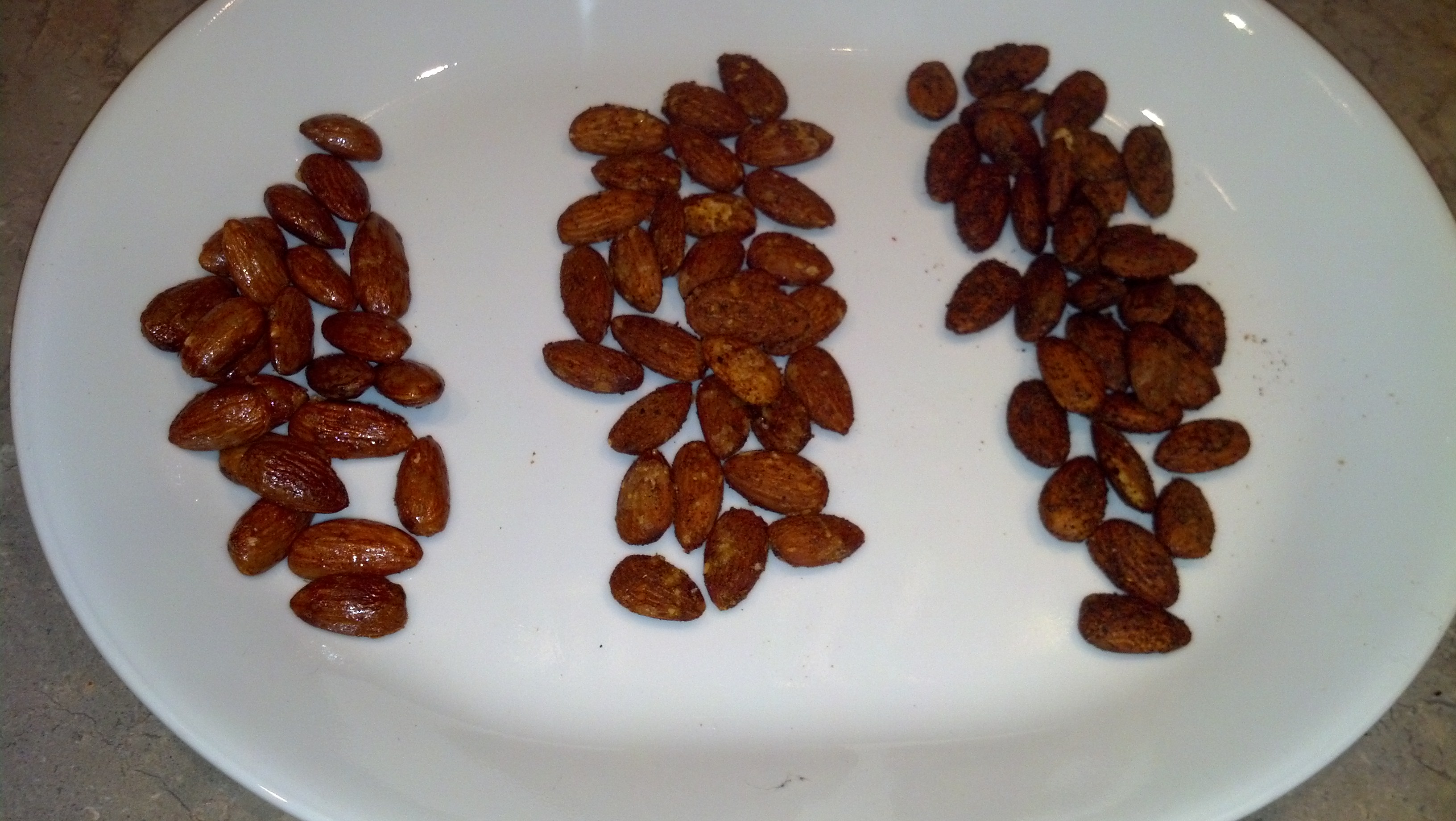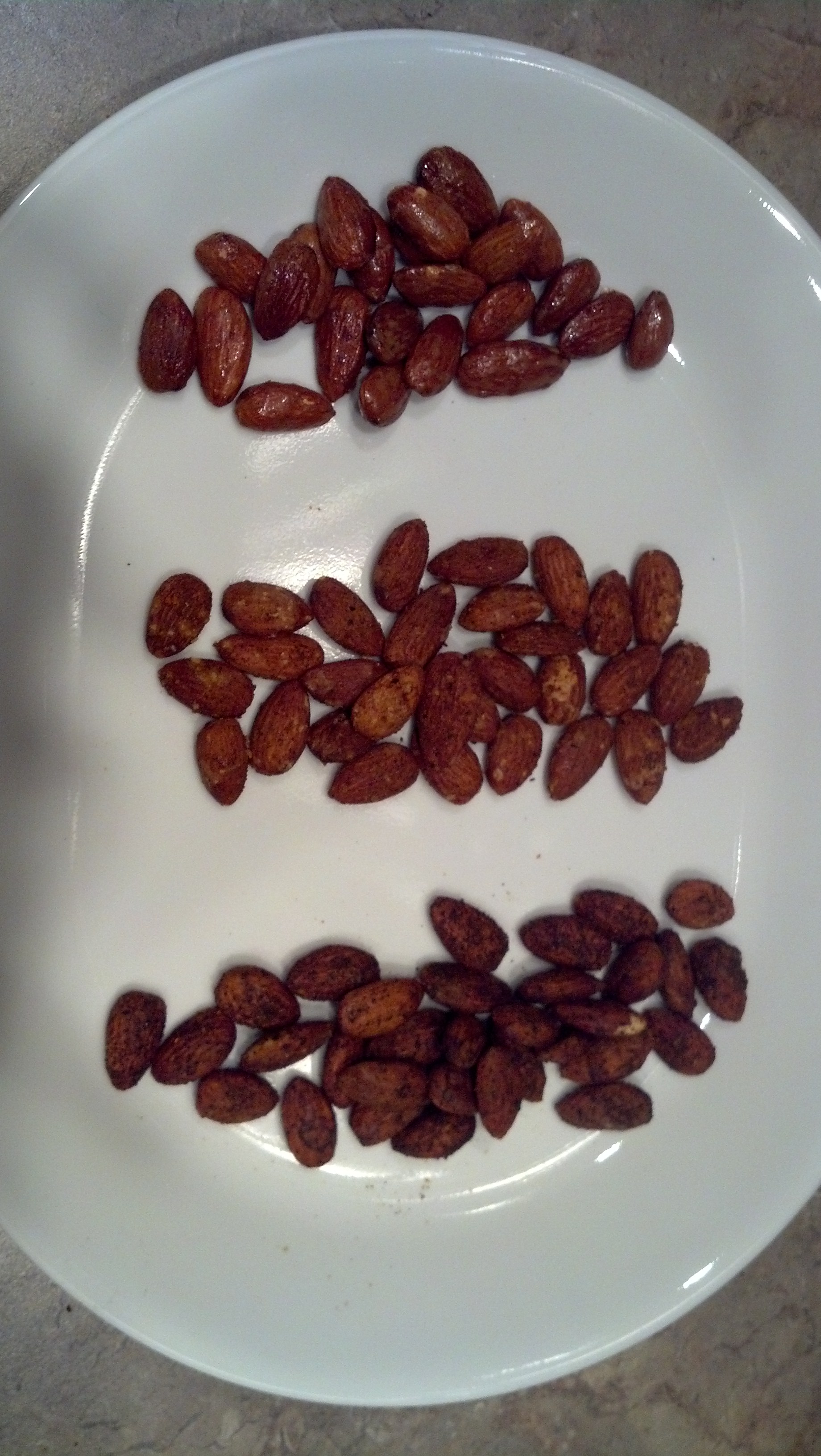 Just finished my first batch of smoked almonds. I smoked them with the A-Maze-N-Smoker with apple and hickory sawdust for five hours and let rest sealed for six days. The first flavor I mixed up some dark kayro syrup, honey and soy sauce and baked for about ten minutes. The second one I beat an egg white until it was nice and fluffy and coated the almonds and then coated liberally with down and dizzy and baked. The third flavor was kind of a put together spicy mix made up of chili powder, onion powder, garlic powder, cayenne pepper and turmeric. I was pleased with them all just wish I would have added more cayenne...