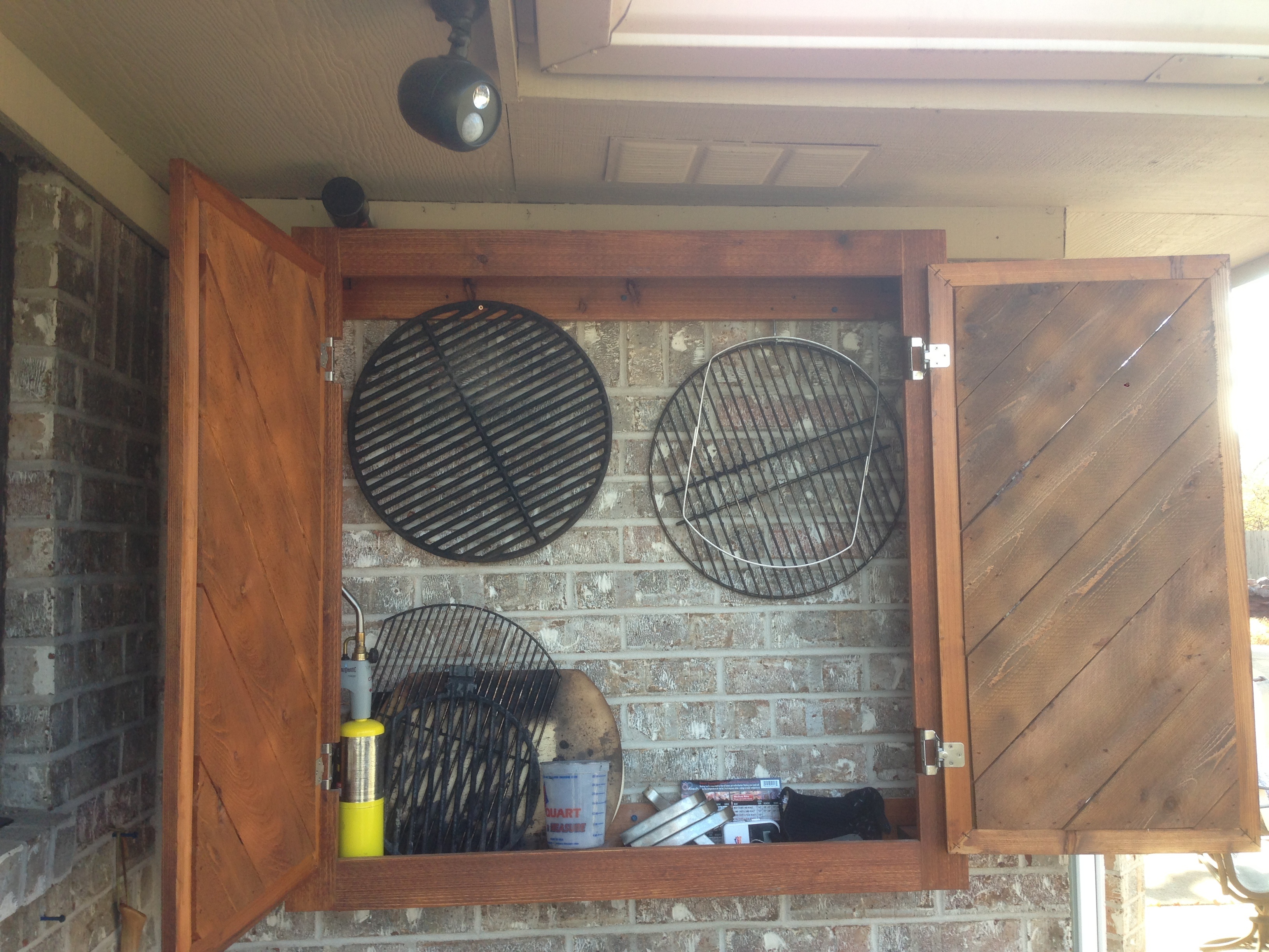 I use a 6' tall plastic cabinet like the Suncast ones available at Home Depot.Cooking on an XL and Medium in Bethesda, MD.
