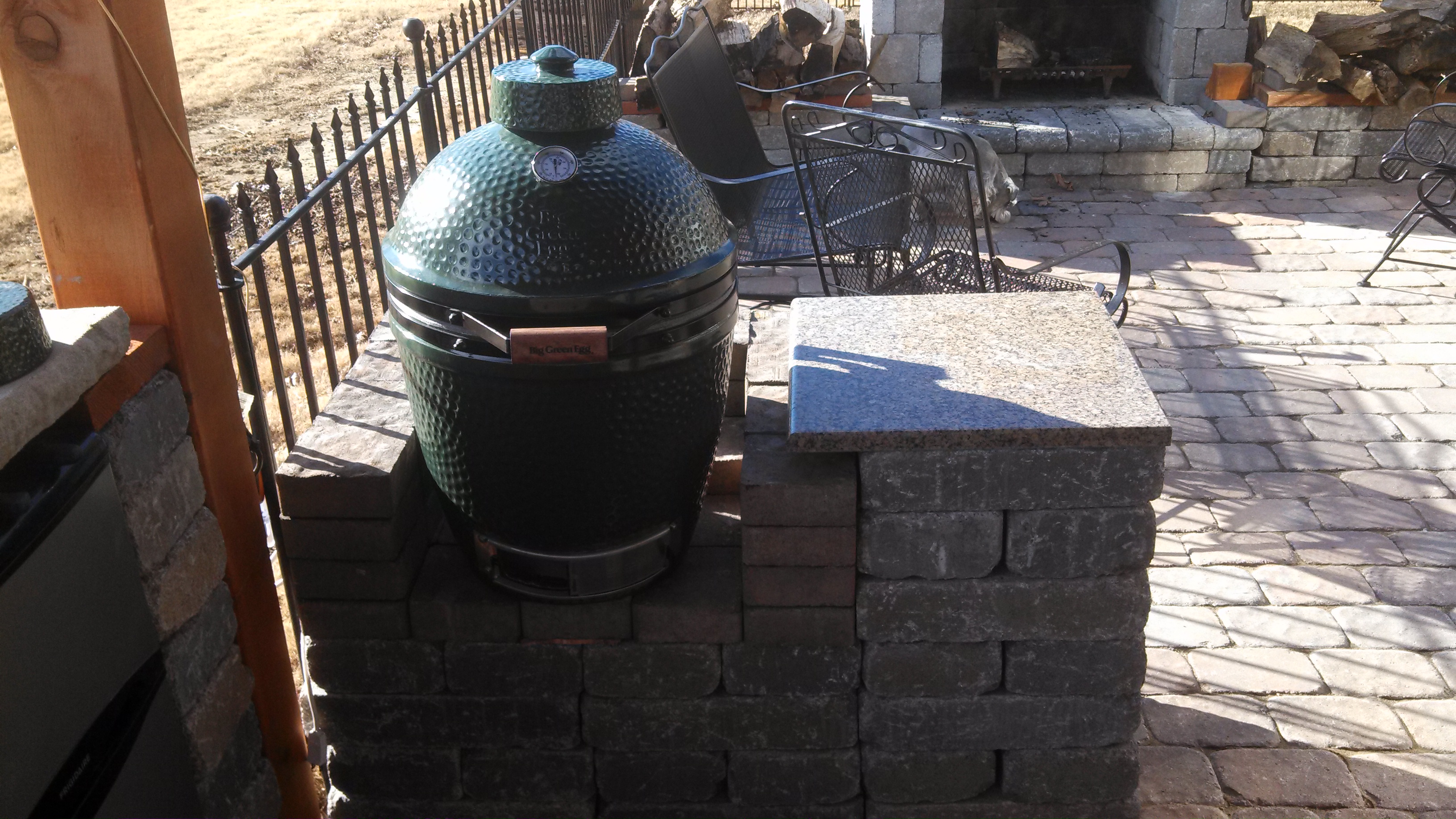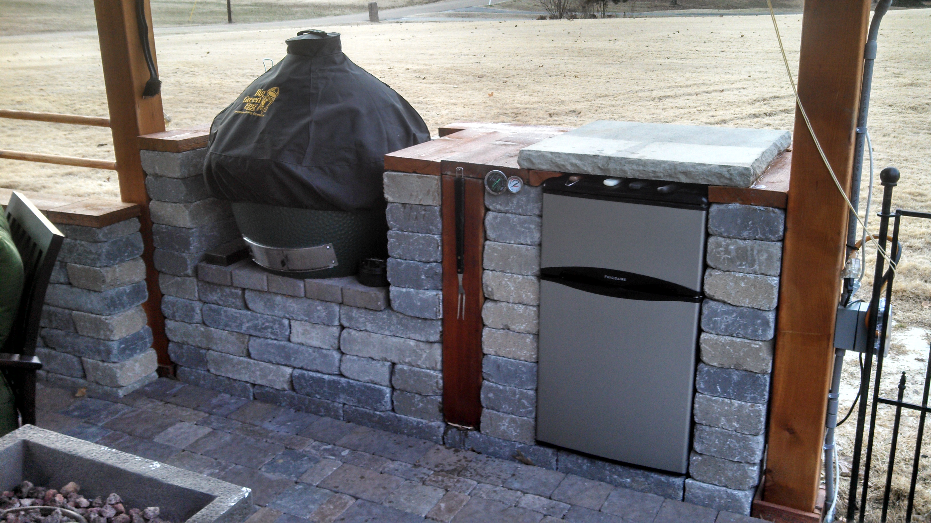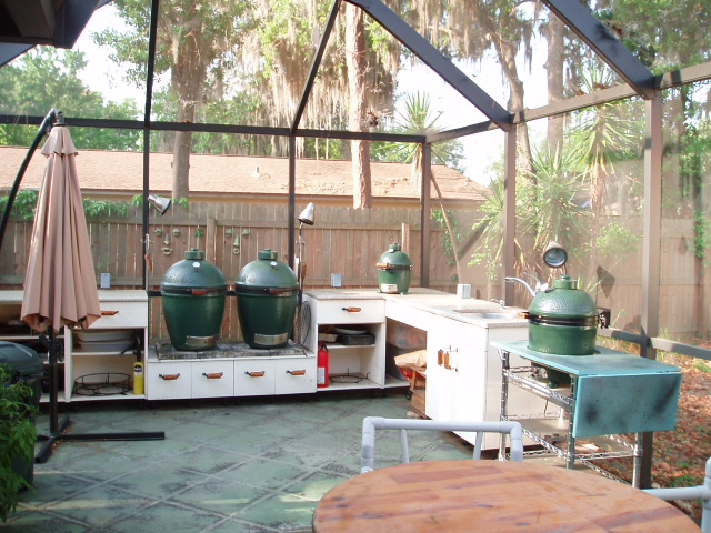 I built an an outdoor kitchen so-to-speak out of landscaping blocks a few years back. Right now I have my big Weber gas grill, an electric smoker, and fridge sitting there, and plan to add my LBGE this Spring. Has a paver floor and a wall on the other side. The good thing is you can add or subtract anything by simply adding or subtracting blocks, and no wood to worry about. I cover the entire thing with a huge heavy-duty tarp to keep things out of the elements.Cherry Hill, NJ