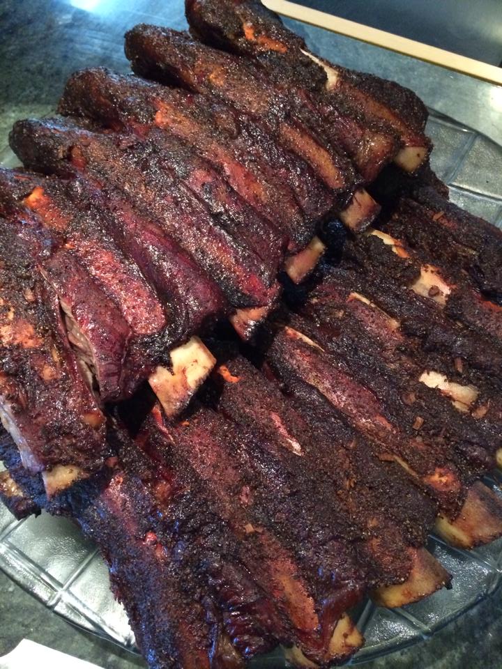 Beef Ribs cooked at 225 for about 3.5 hours using Tabasco wood chips .