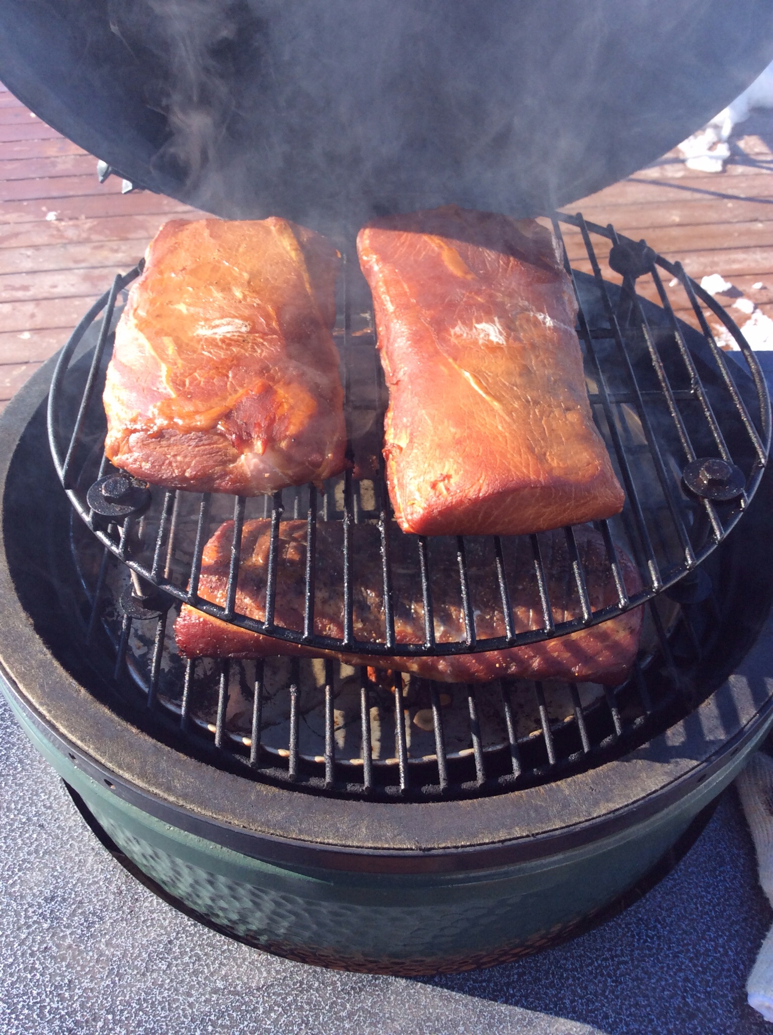 I decided to try it without the water pan this time to keep it simple and avoid any blocked airflow that may have caused my last smoke to go so long.  Based on advice of folks here, I shouldn't need the pan with the BGE.  (unless I want it for aroma or to catch drippings so they don't burn on the plate setter)  I'm all about keeping it simple, though, if the results are good.