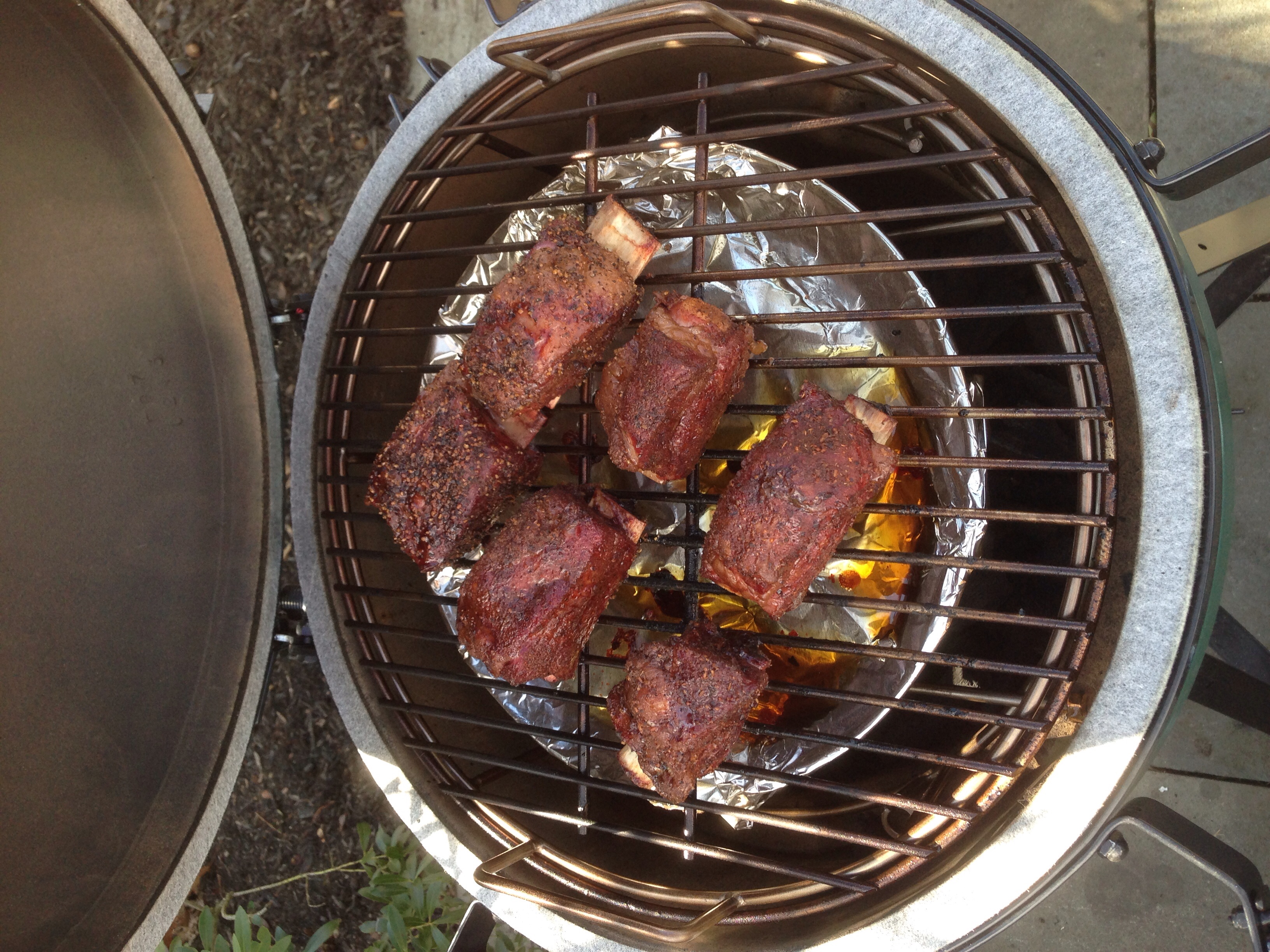 Smoking some short ribs up on the new MBGE. 2 w/SP&G, 2 w/DP Cow Lick and 2 w/DP Red Eye Express.