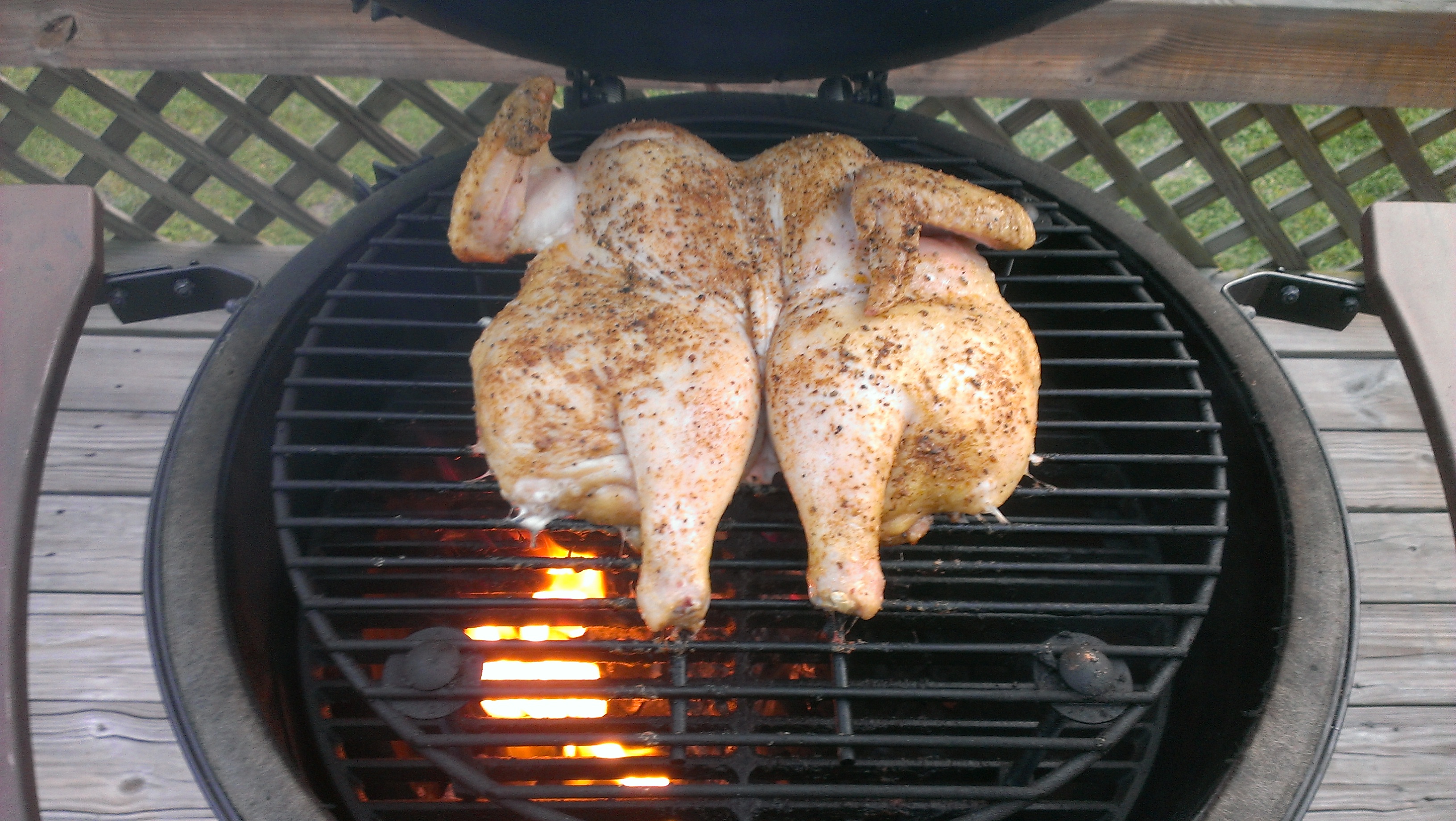 SWMBO asked for Spatchcock. Ask and ye shall receive. Picked up a two pack of yard birds at Sams Club. Spatchcocked, EVOO, kosher salt, cracked medley pepper then dusted with some cajun spices. And then just a good ole dressed up romaine lettuce salad. Yard bird is on with cherry chunks left over from last brisket and WGWW lump. 375℉ raised direct. Listening to some CCR, Skynyrd, Rush etc on the radio enjoying a cold one. Even the yard bird says High Five Friday ;-). Enjoy your Friday y'all.