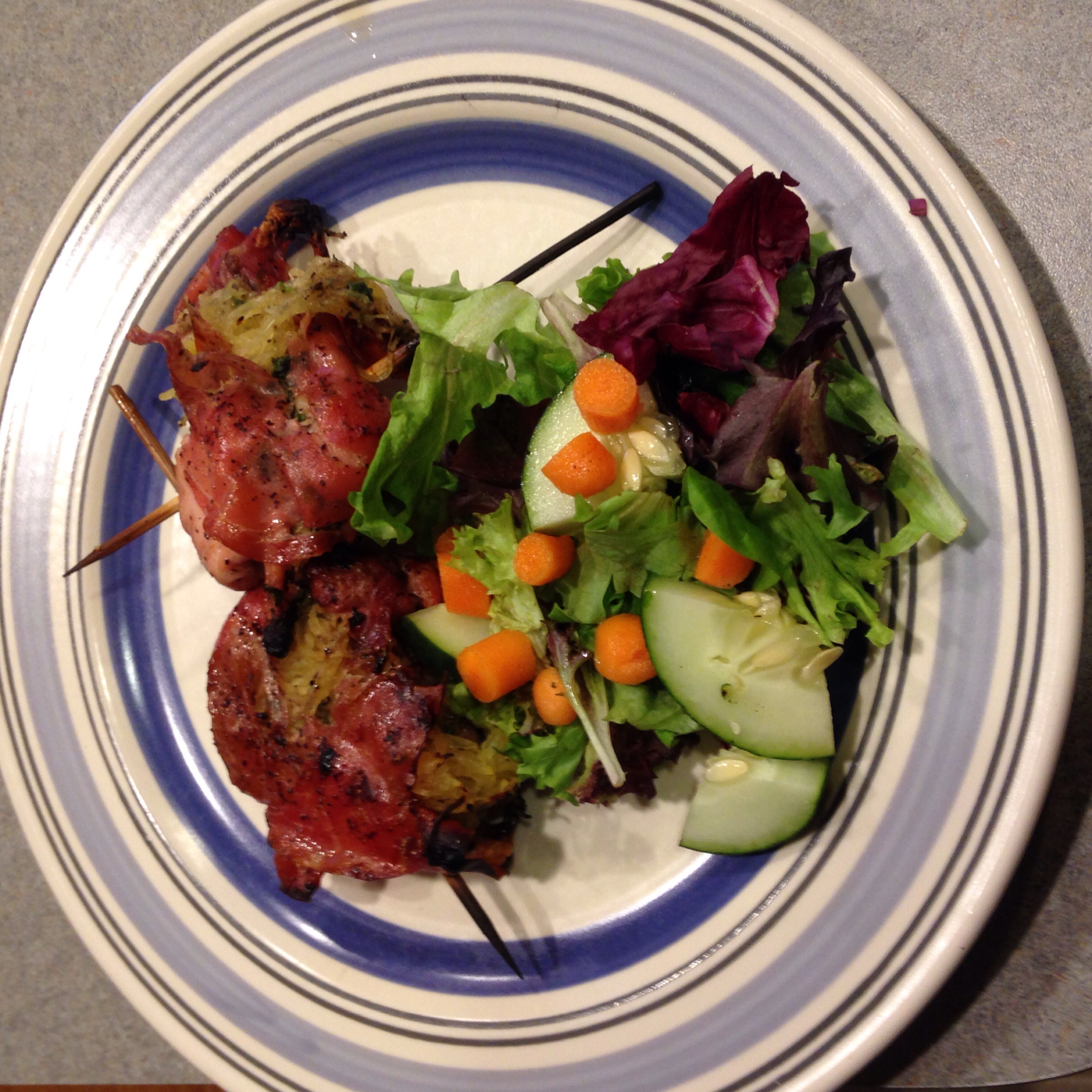Chicken thighs stuffed with Parmesan cheese, chopped kale, and spaghetti squash. Inside of the chicken was dusted with S&P and the outside was dusted with pepper and garlic salt. Some were wrapped in proschuto and some weren't. Didn't have enough for all of them. These were delicious!