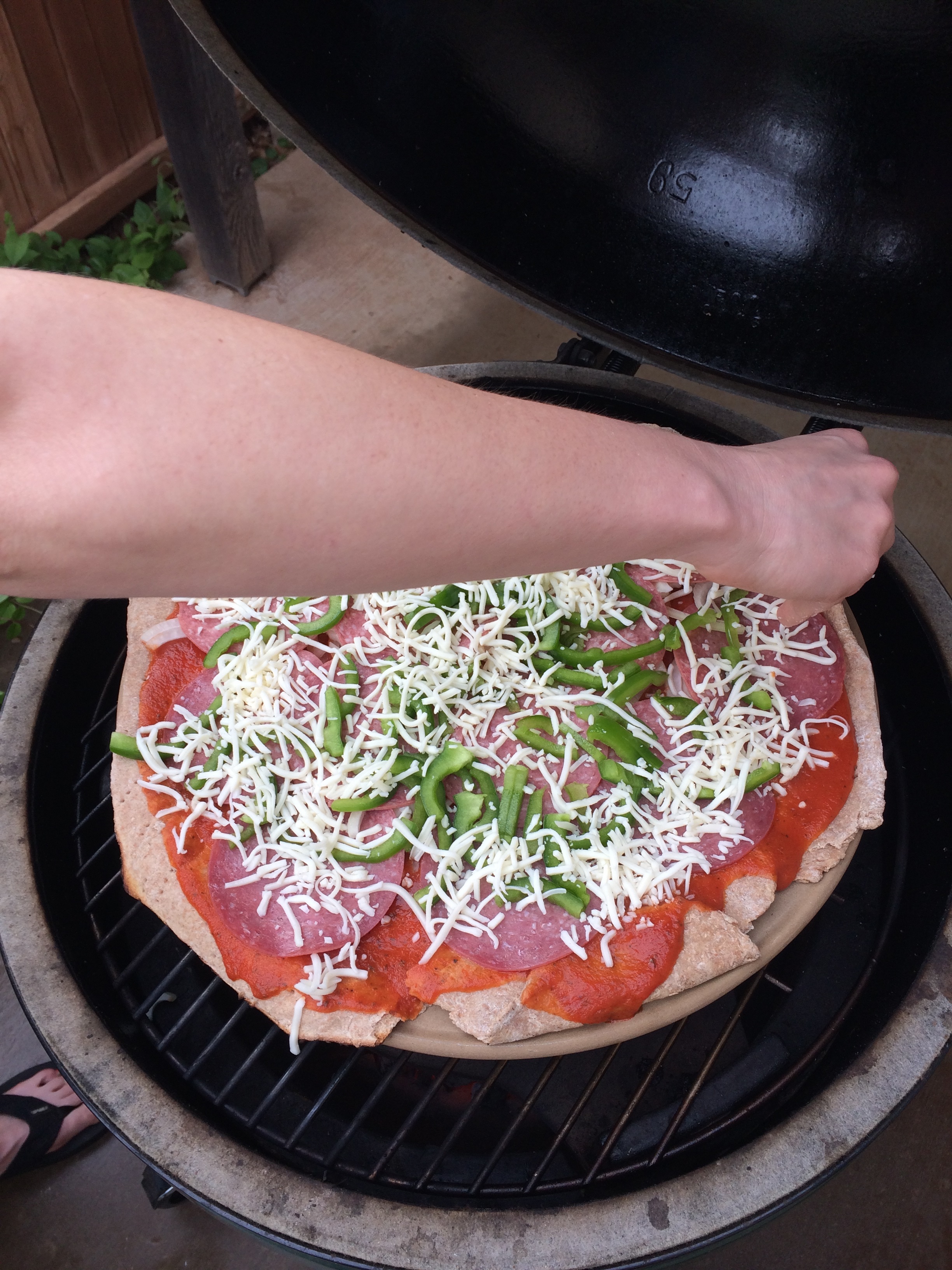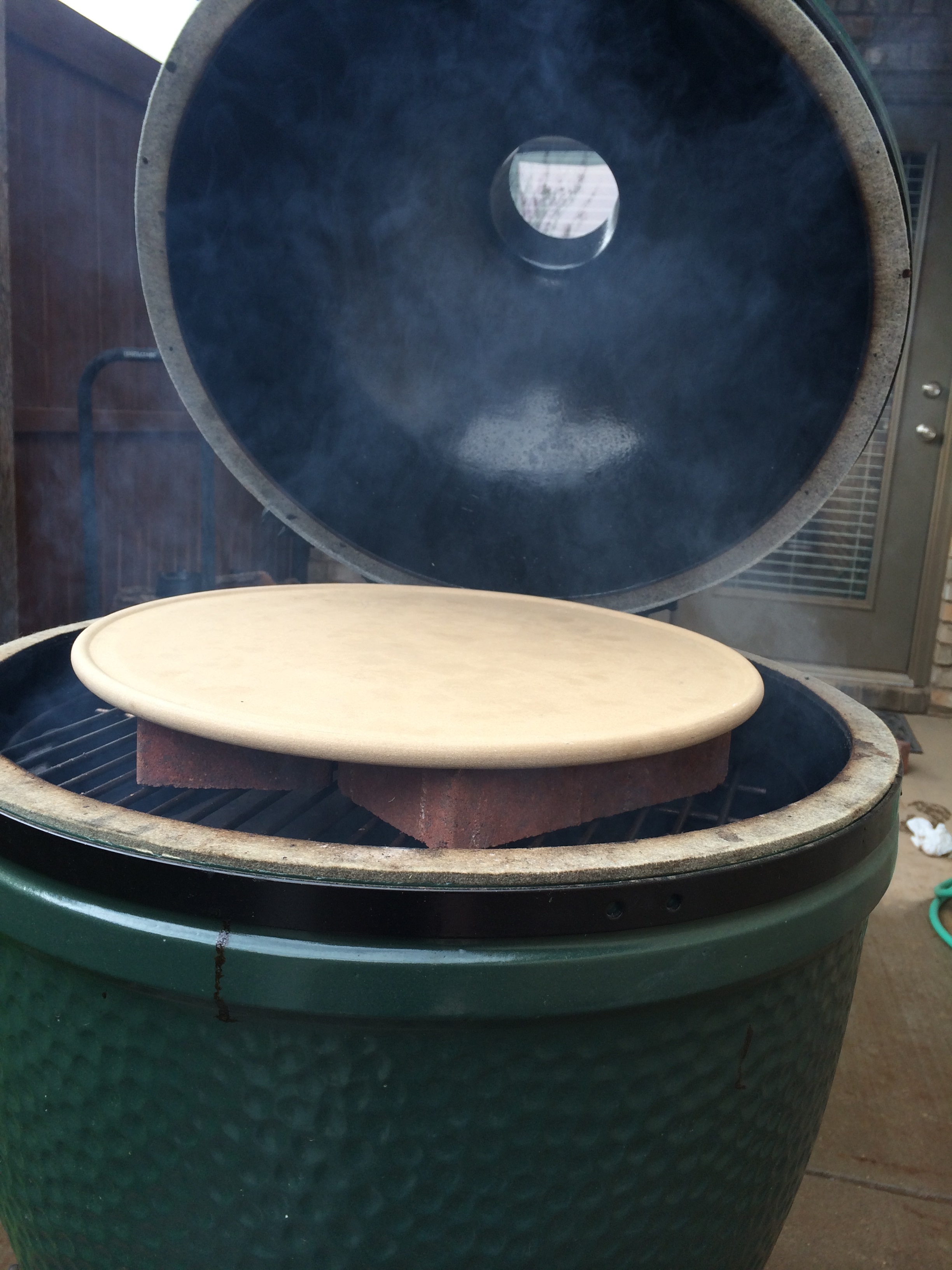 • I go platesetter legs up, a grid, some paving stones, another grid and then my pizza stone. The idea being to get the egg up higher into the dome so that the crust does not cook before the toppings.