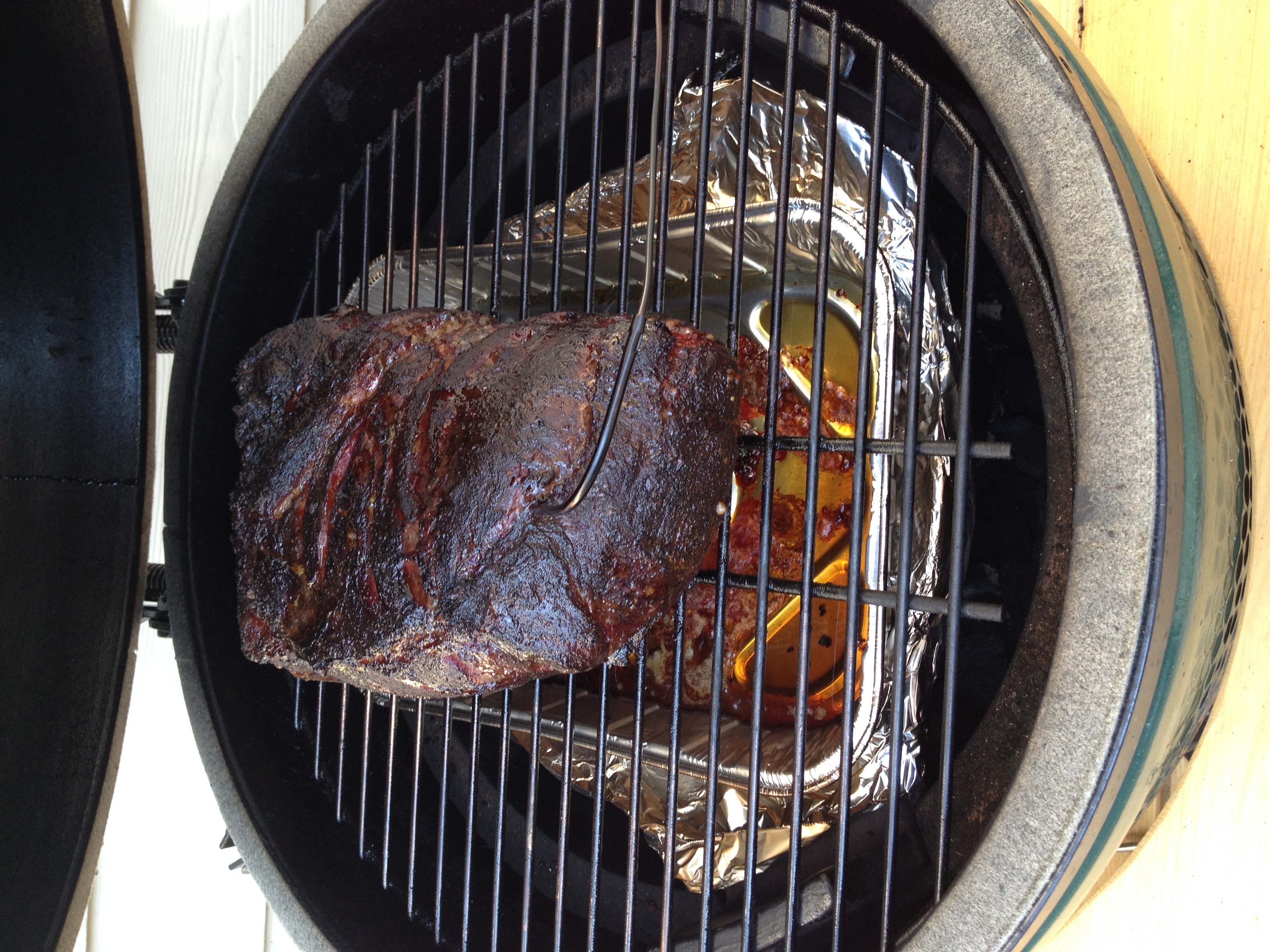 • I cut off the fat, there is enough mixed in with the meat. This will give you more bark with less fat. No mustard. Rub and put on egg. Try to get dome between 270-300*. Pull at 200-205*. Usually around 12-15 hrs, depending on size.