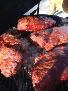 *  after about 1.5 hours the butts were still only about 170.......i was getting panicky at this point and wished I had left my self more time......i had figured on about 7.5 hour cook with 5 pound butts.......so I cranked the heat up to about 325 and even drifted closer to 350 for a bit........