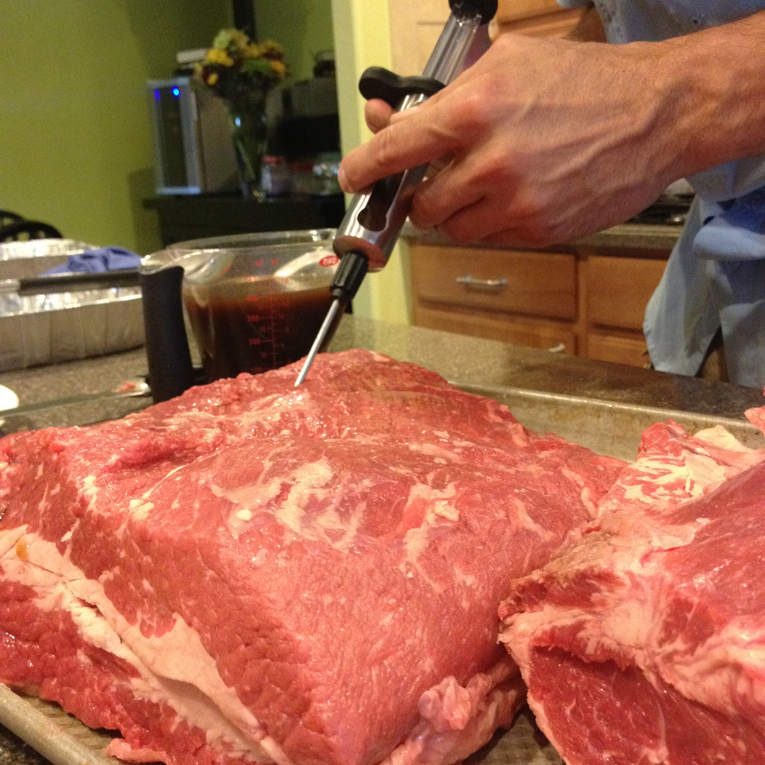 • Here's an update.  Even after trimming the brisket (which I think I did an adequate job?), it was still too long to fit into the LBGE.  I took some advice from a local competition bbq'er who suggested I cut it in half to fit.  I then injected both pieces with a mix of John Henry's Cuz'n Buddy's Marinade and Shiner Bock beer.  The remaining injection was poured into the pan with the point section.  Both pieces were then dusted generously with John Henry's Texas Brisket Rub.