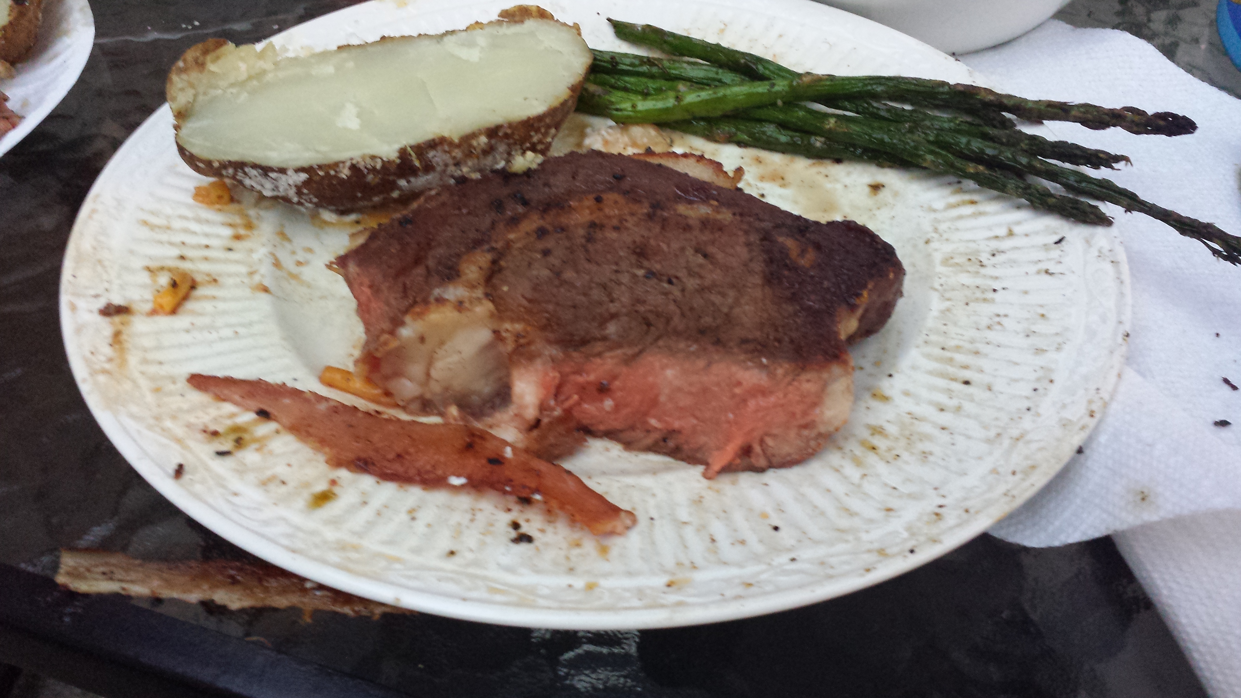 I was talking cooking on the BGE with a guy at work today and it got me in the mood to make something nice for my wife and I. I went to the store on the way home and picked up two Delmonico steaks, two potatoes, asparagus and salad mixings. I cooked the asparagus on the top rack of the AR along with the potatoes and then reverse seared the steaks on the bottom rack. I finished the steaks in my cast iron skillet. Everything came out great! I was on the phone for work so I was only able to take a picture half way through the meal. I haven't had a good steak in quite a while and it definitely hit the spot. I sent a picture to the guy at work and told him he needs to step up to the big leagues and get an Egg! Haha he had no idea how versatile the Egg is.