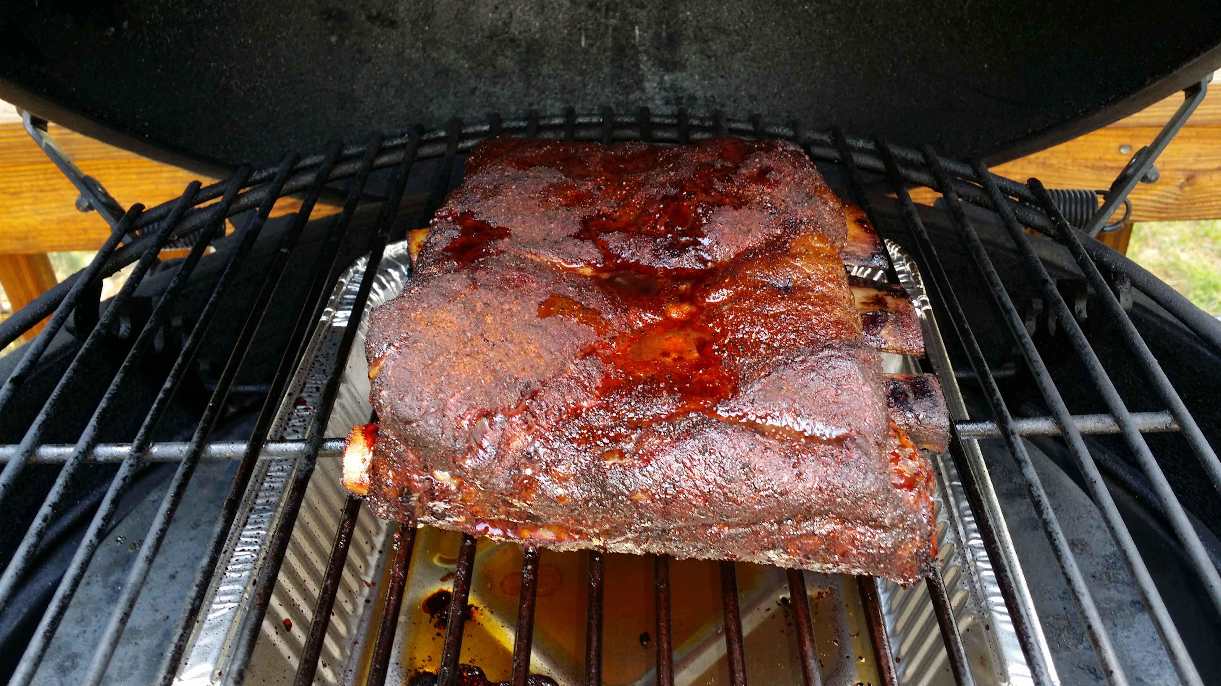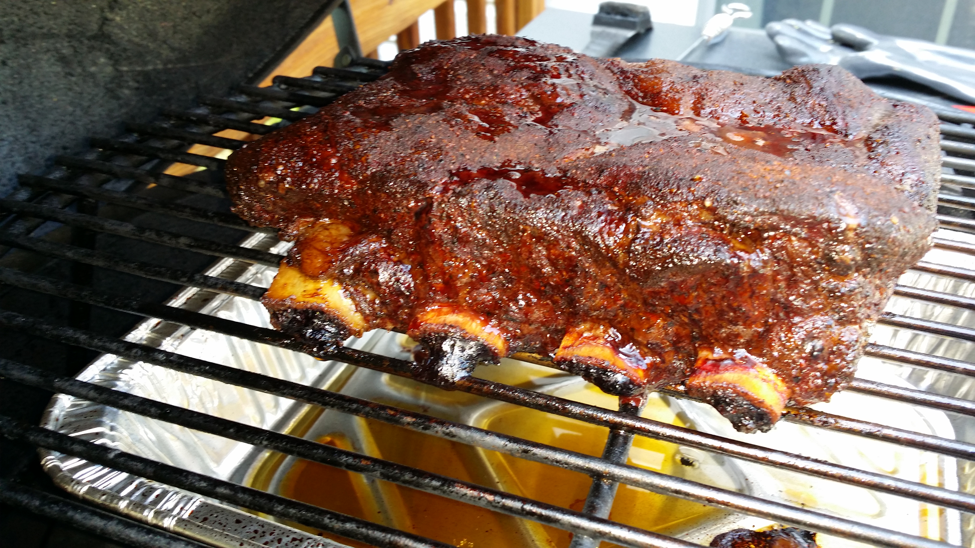 I Pick up a 4lb slab of beef ribs yesterday. I trimmed the fat cap off the meat side of the ribs. I did nothing to the bone side as the meat are on top. Rubbed them down with Cow Lick last night and put them in the fridge. I threw the rack on the pit this morning/afternoon while i cut the grass. I have the egg set up at 250-275 dome. I hope these come out as good as the brisket i did last w/e. I'll keep you posted w/ pics. I am using hickory and cherry for smoke. Smells great out back.