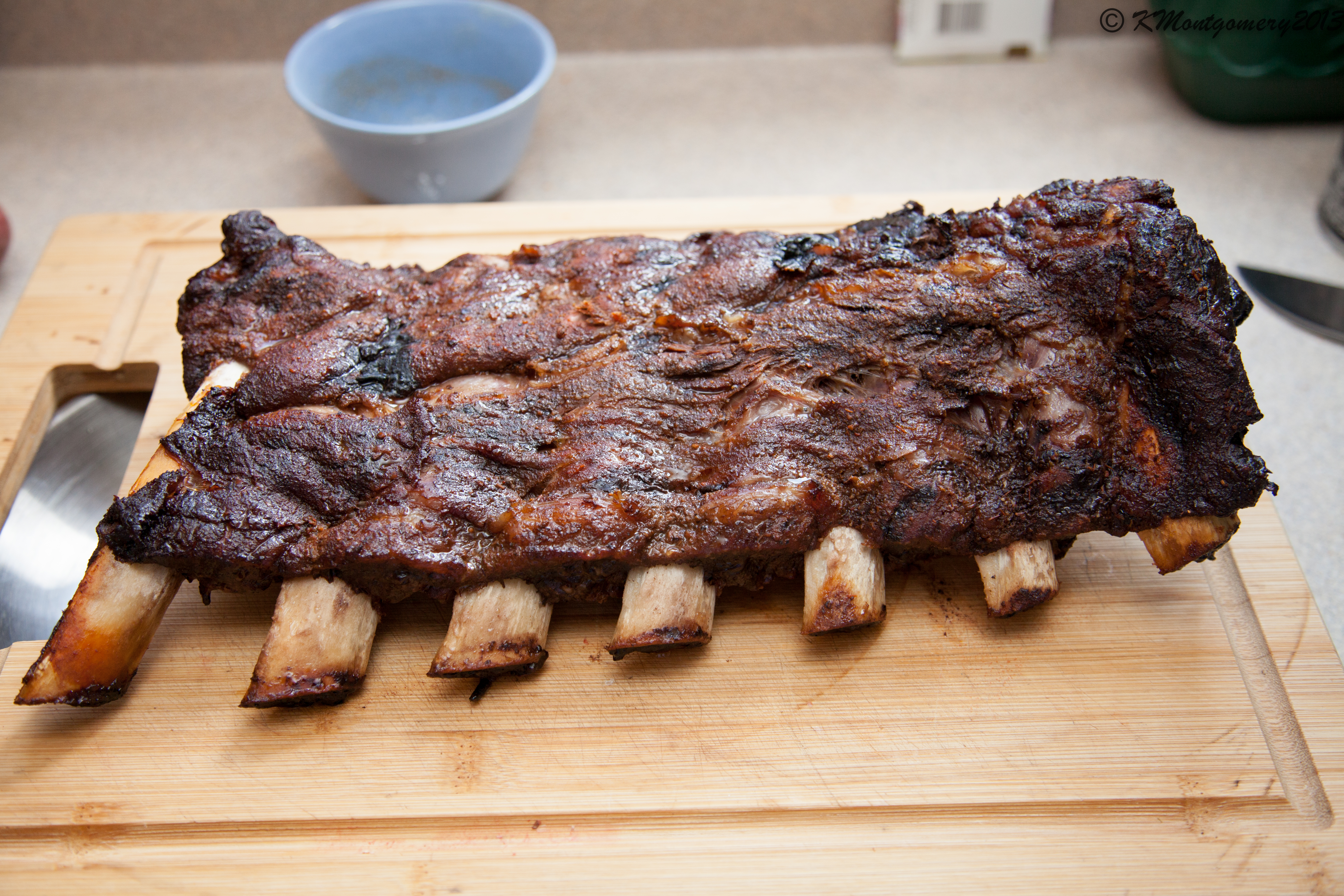I have read most of the forum topics on them, so I decided to remove the membrane, rub em up with DP down and dizzy. I stabilized the egg and just put them on a 250* indirect bone down with pecan and hickory chunks. I have also read the recipe from http://www.nibblemethis.com/2012/04/beef-ribs-giveaway-party.html and thought I'd stick pretty close to this as it was pretty much how I figured the process would go.