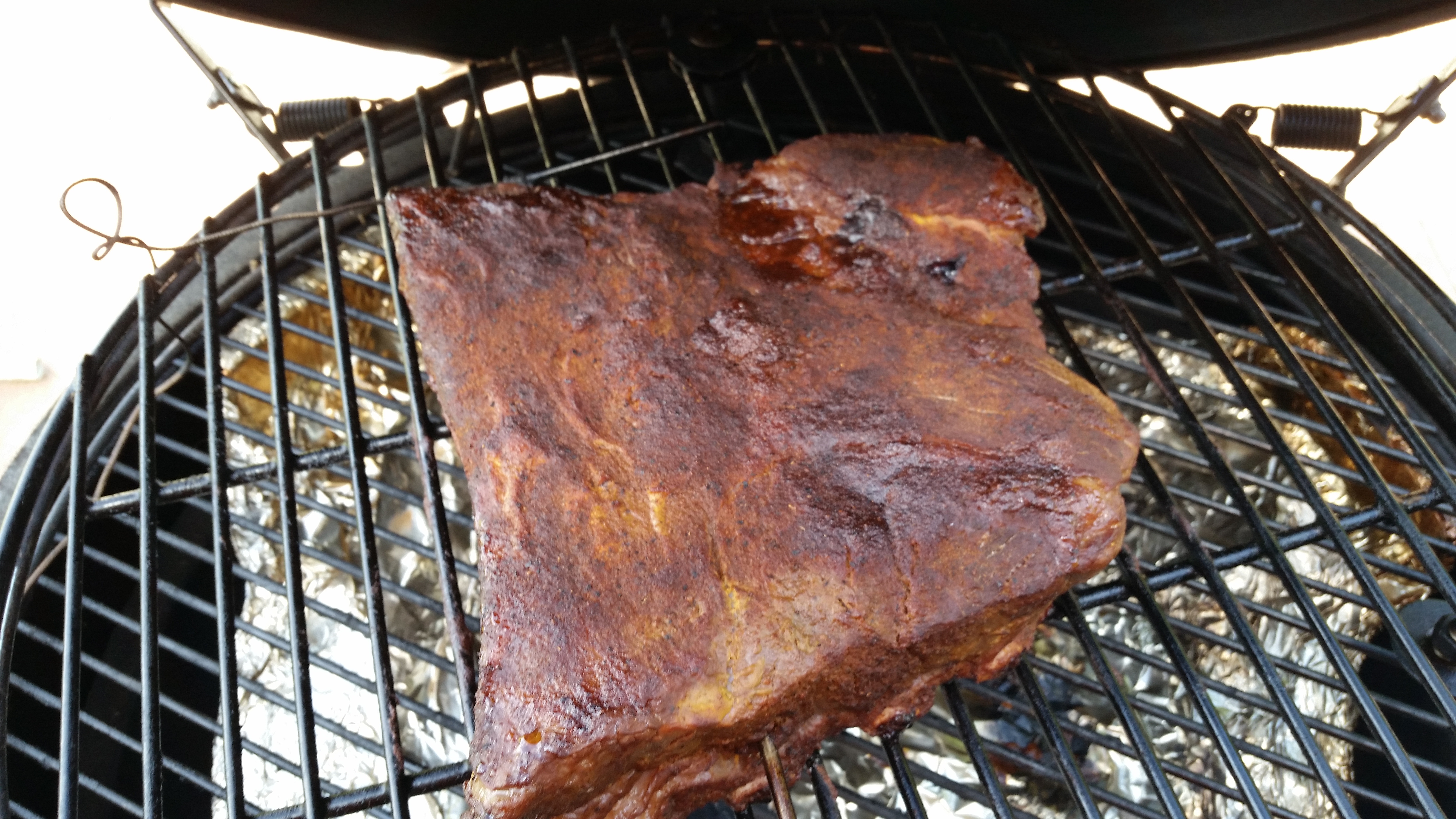 Looking good Monty77. Sorry I am riding you're thread, but no one was responding to mine. Here are mine after an hour and a half. Egg is at 280ish and doing well. I put some honey and brown sugar in the foil before I wrapped it up. They are back on and taking them to 180. I hope they are good.XL, WSM, Coleman Road Trip Gas GrillKansas City, Mo.