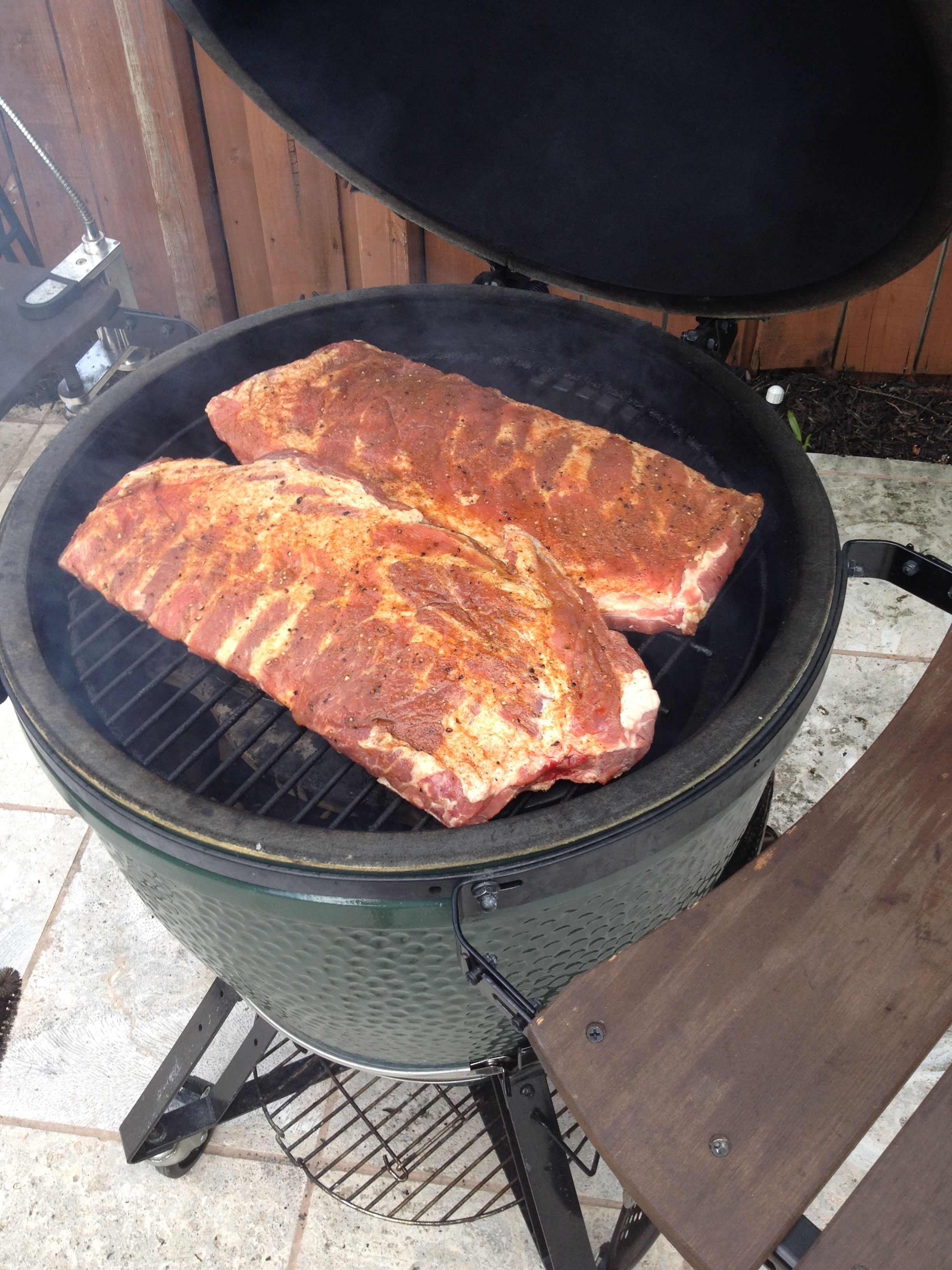 I just put my first attempt of St Louis style on at 11:30am ET. Trimmed them, put a custom rub on last night and let them sit overnight in the fridge. I'm thinking four to five hours at 225 w/ some apple and pecan chips over a tin of summer ale.South Florida - Large BGE (DOB: 12/07/2013)