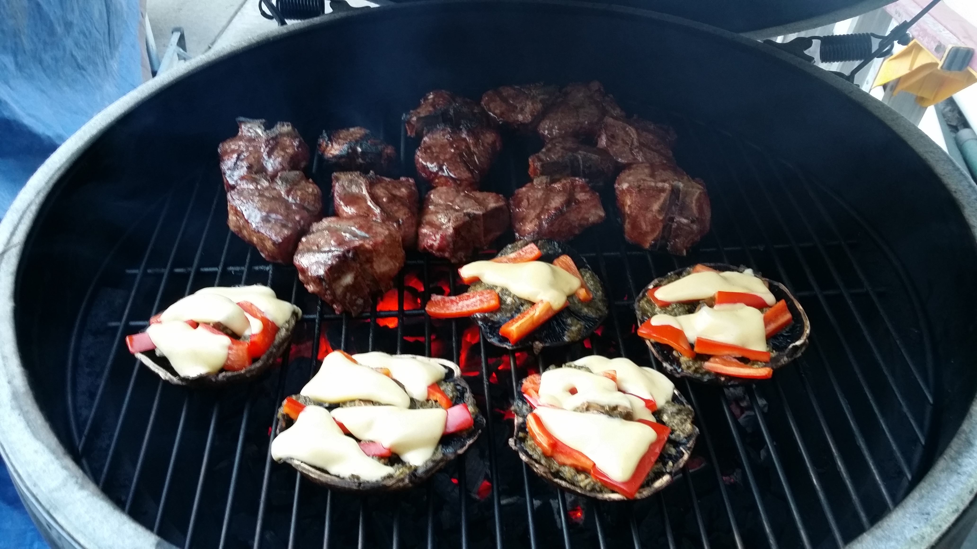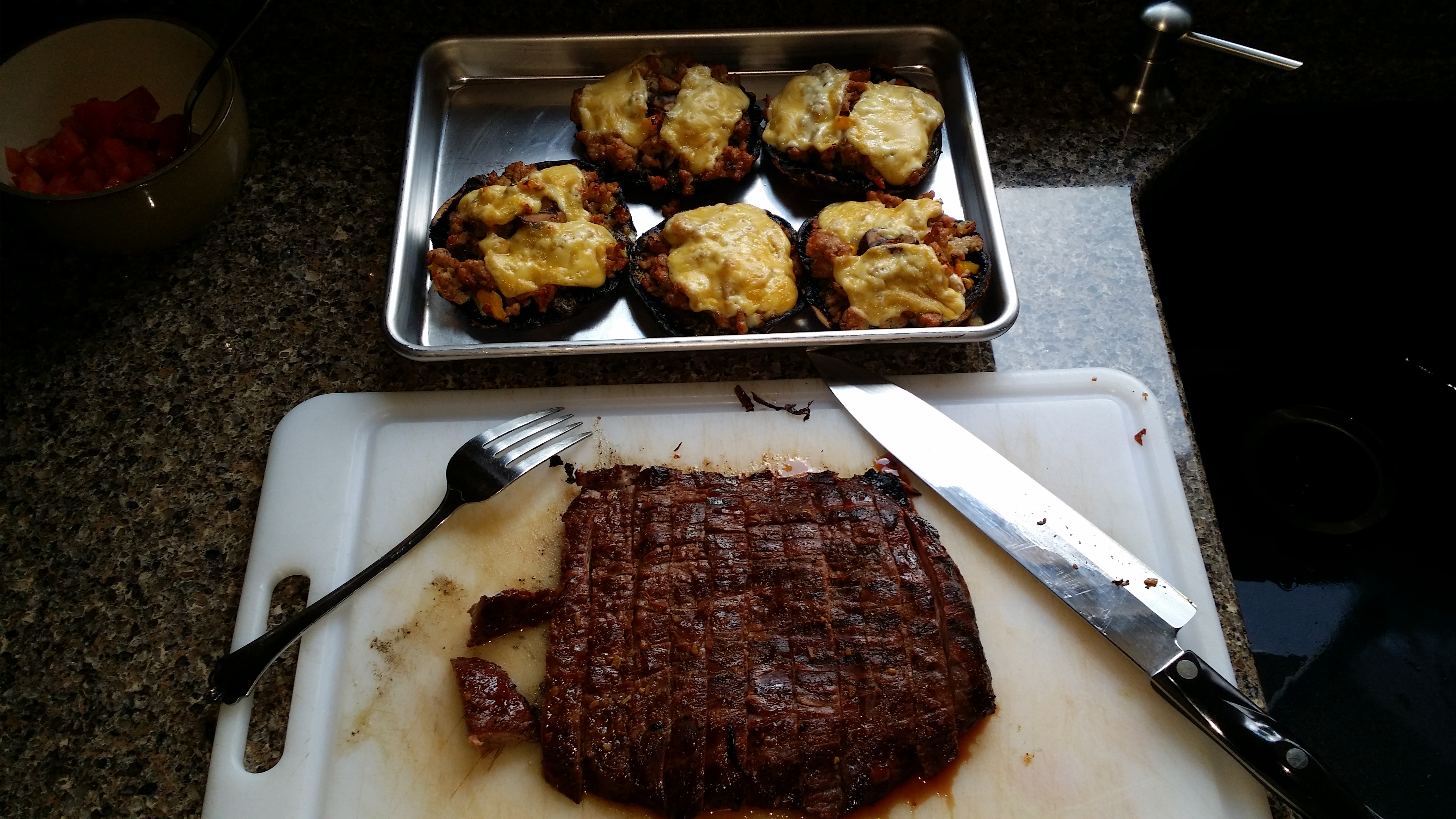 Friday night I did Lamb Chops with Grilled Mushrooms, Pesto and Guda Cheese. Sunday did a Flank Steak with Mushrooms again but this time stuffed them with Chicken Sausage. Man were these all good.