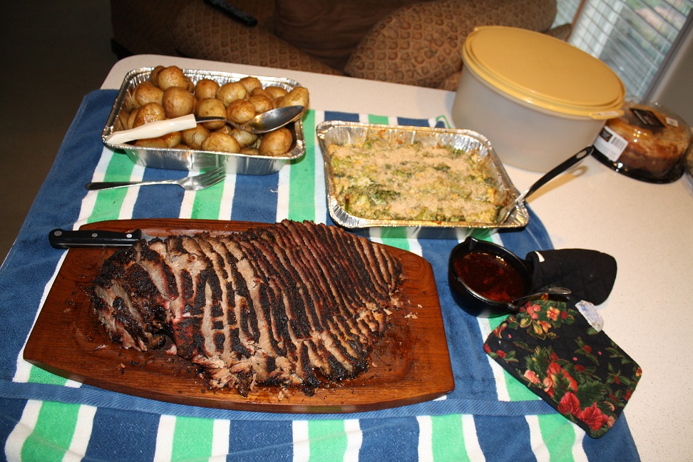 Great job and it looks tasty. I have yet to cook a brisket that fast. Did you put it on straight from the fridge or let it sit out to get to room temp? That would speed it ip a little maybe. If it tastes good that's all that matters.XL, WSM, Coleman Road Trip Gas GrillKansas City, Mo.
