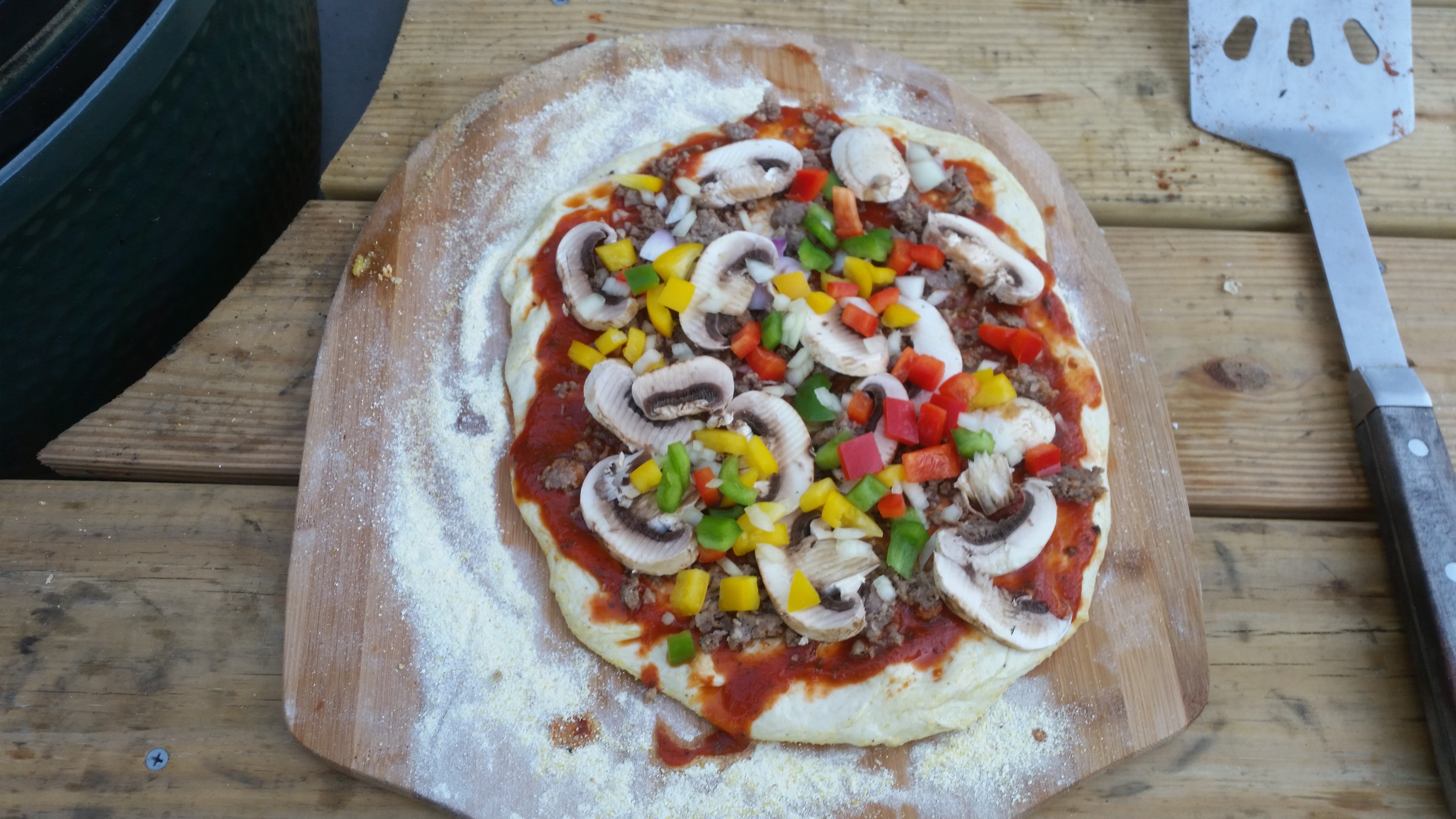 Looks great. One thing I do is when using fresh mushroom, sautee them in a little butter w/ a little salt to pull out the moisture. If you use a lot they will make your pizza soggy.Love pizza on my egg!