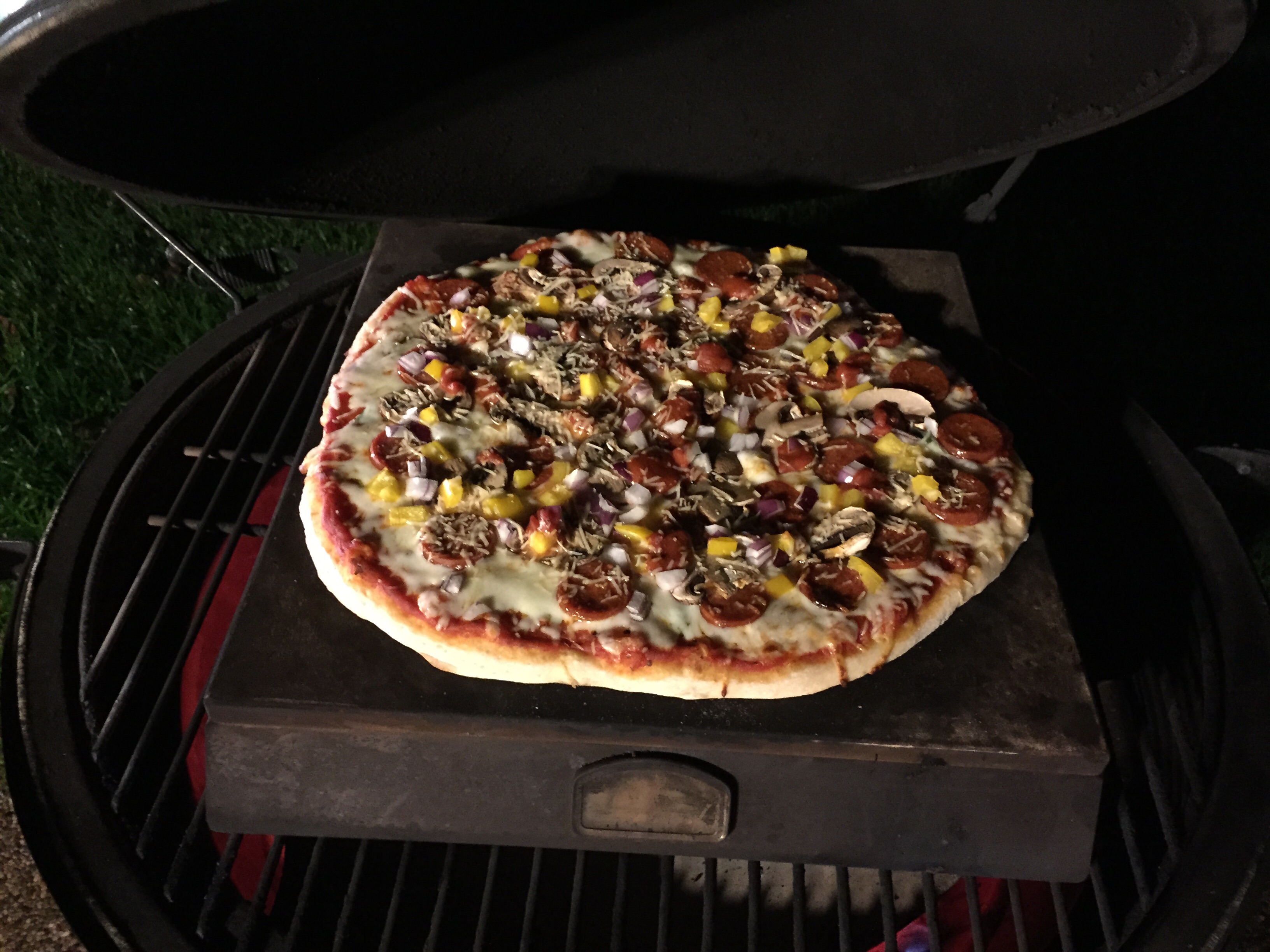 Pizza is a favorite around here, this one was scaled back a bit trying to find that perfect amount of not to many toppings. I often put way to much stuff on my pizza making it only edible with a knife and fork.Charlotte, Michigan XL BGE