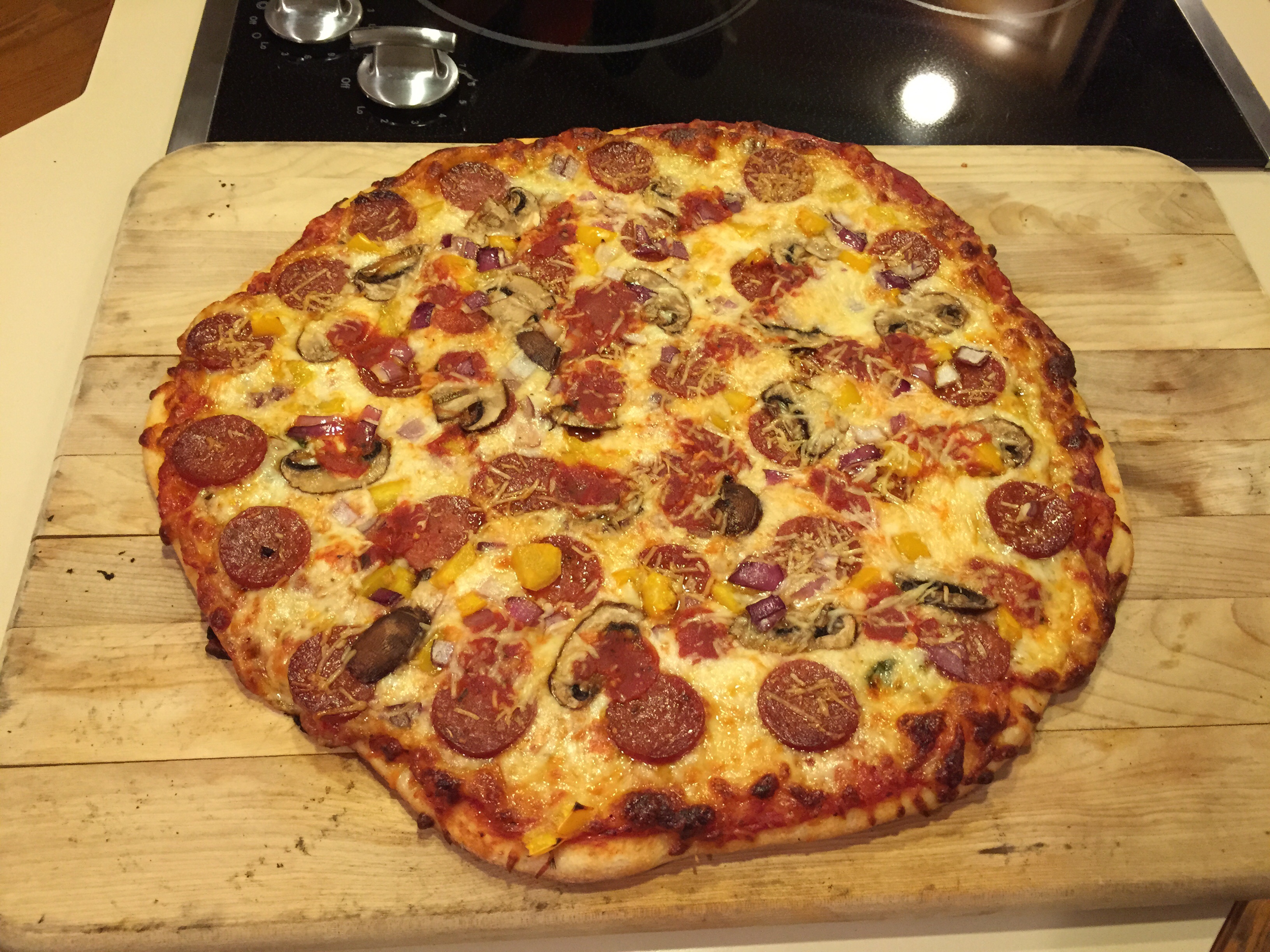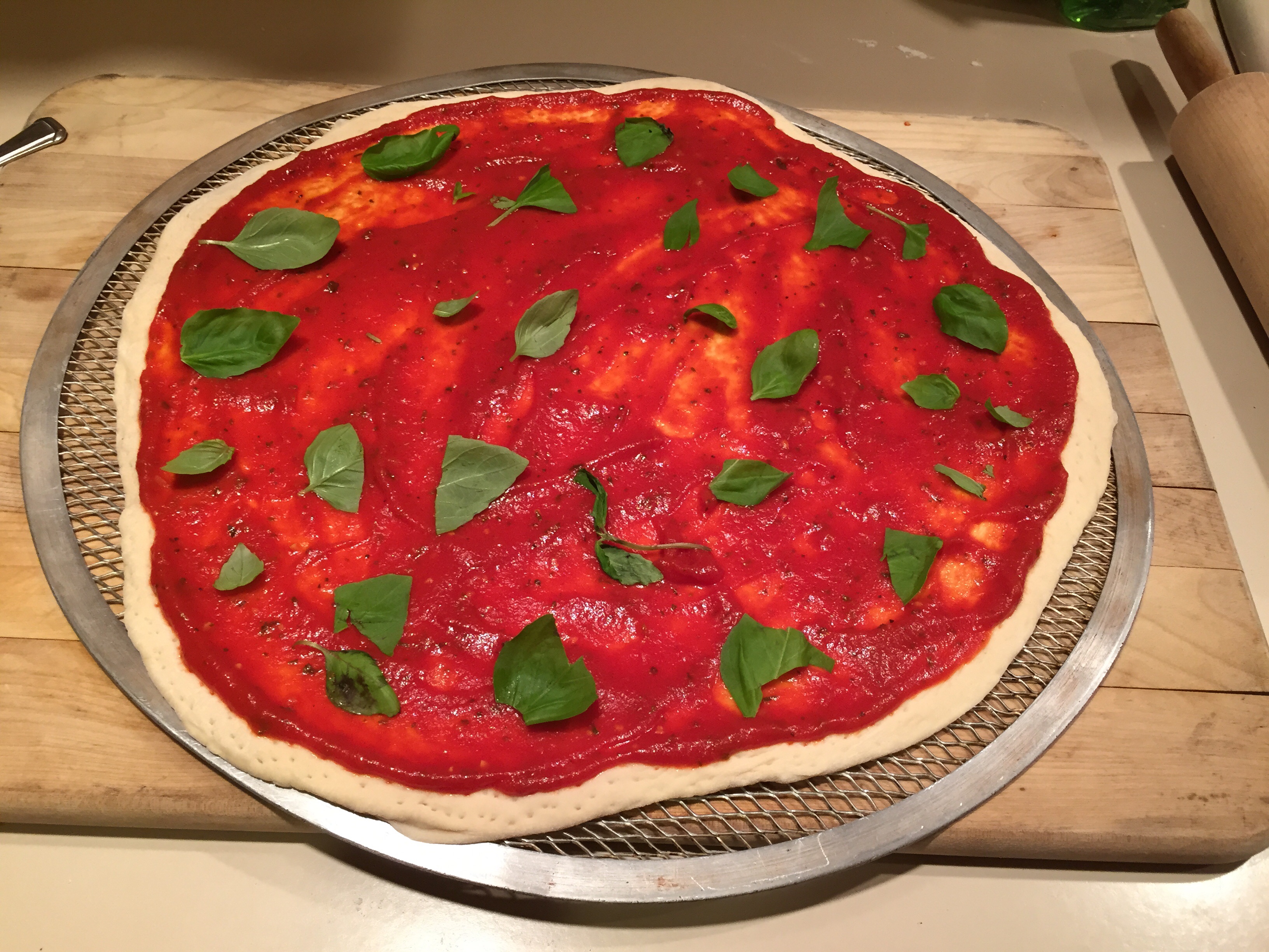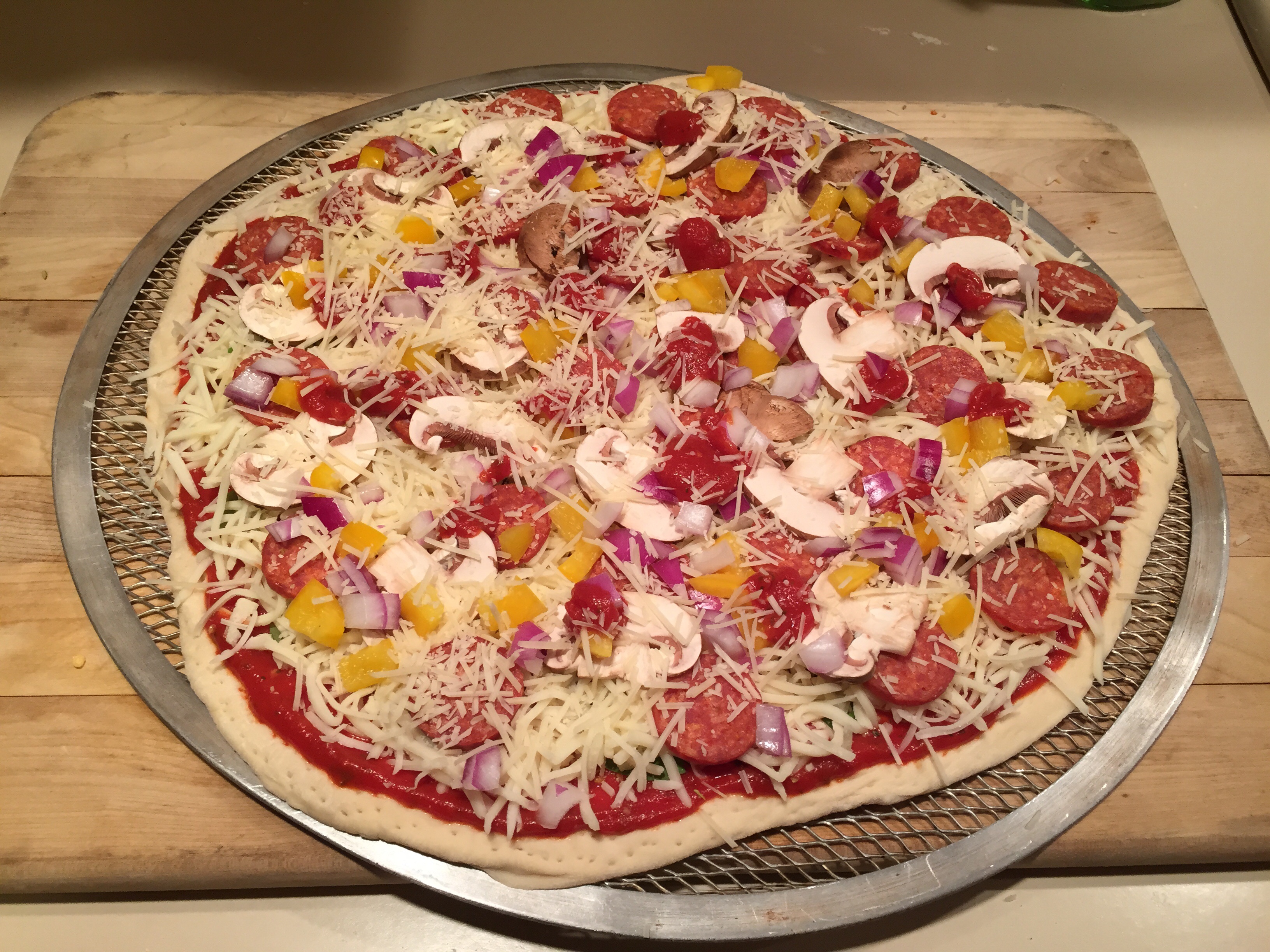 When I'm home on Fridays I make Pizza, this is Friday's Pie, 12 inch dough/ball/skin rolled and hand tossed to about 15 inch (that's A 16 inch Pizza screen) we like thin crust, sauce, basil, cheese, pepperoni, mushrooms, yellow peppers, onions cooked at 500 until firm enough to slide off pizza screen (5 minutes) then finished until well done/crisp/yummy about 15 minutes total.
