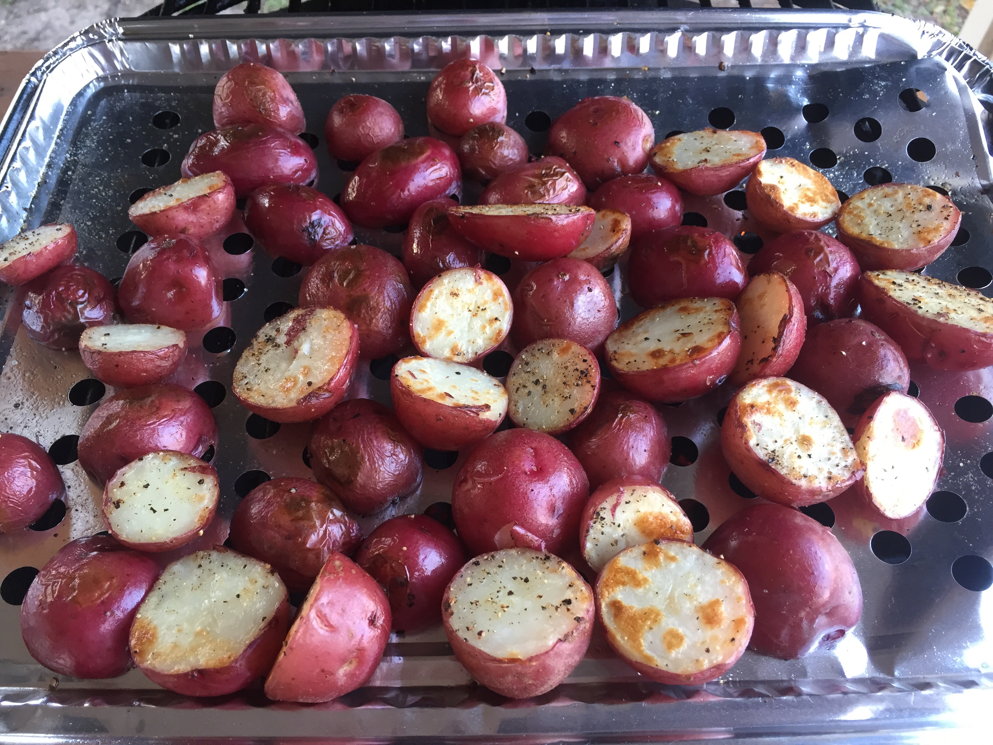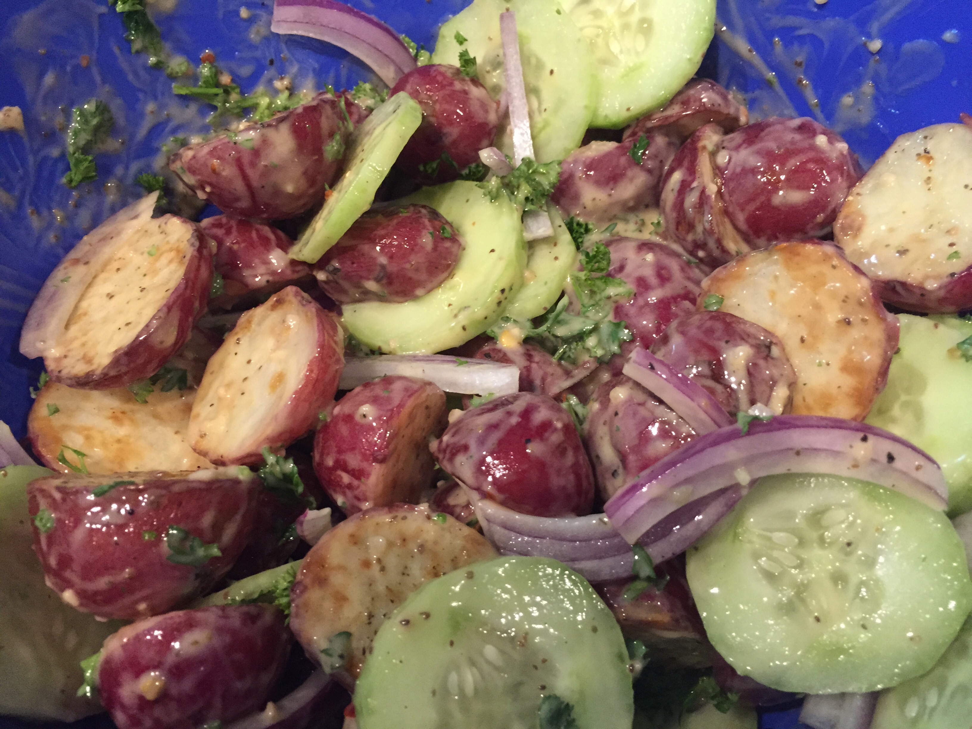 Cook potatoes (I oar boiled 15 minutes and then grilled), then combine with dressing. Add: