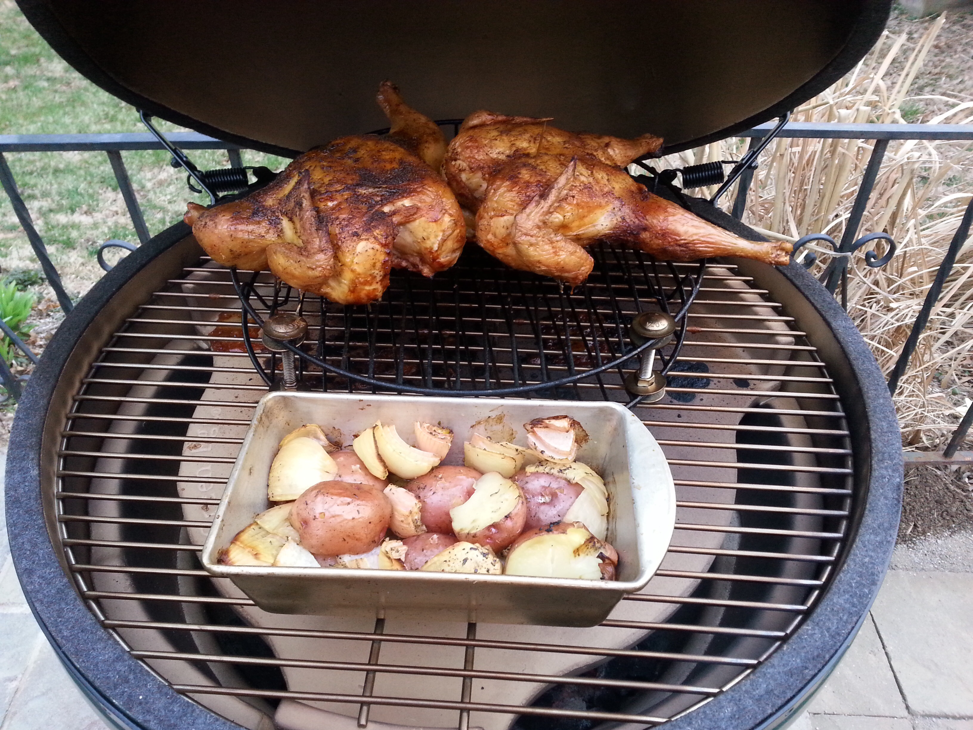 Love me some spatched bird. Those look nice.If you wrap some heavy duty foil around that platesetter, you can save yourself a lot of clean up work.