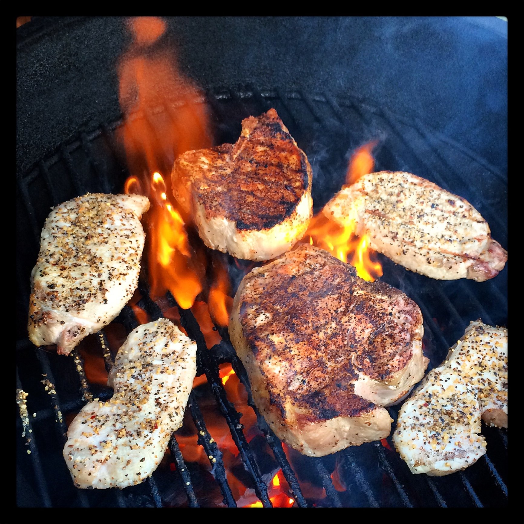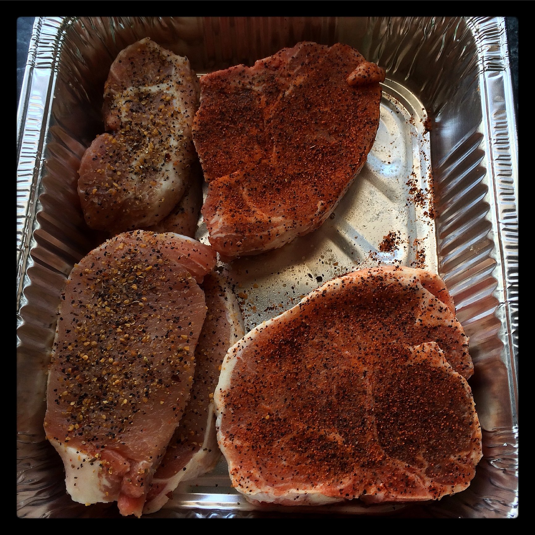 Two bone in thick cut chops and a few thinner cut boneless ones... Used Holy Cow and Montreal on them. Did is them at about 550°