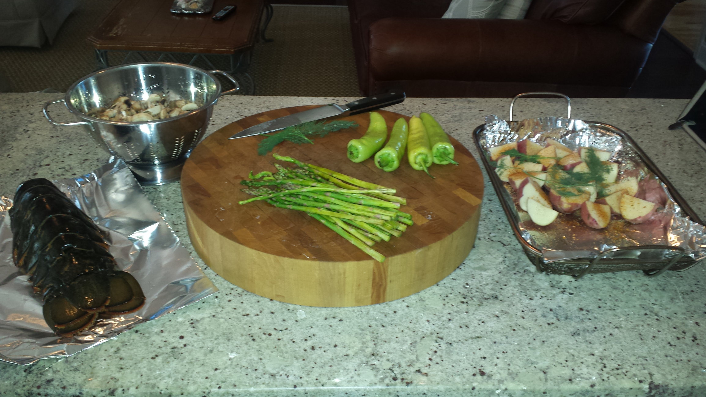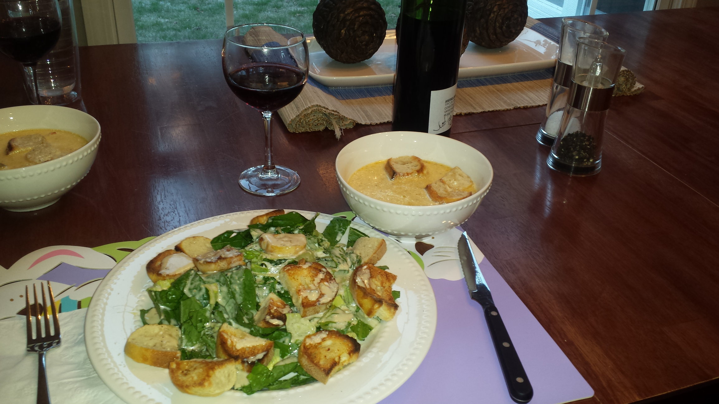 Thanks again everyone. I actually did pare down the menu a tad. Went with Cesar salad with homemade dressing and homemade croutons. Lobster bisque from scratch; found a 1 1/2 lb lobster tail at the market. This thing was huge. I even changed the steak to the other one we ordered with the SRF order and went with the 2.2lb bone in cowboy ribeye. This was Prime ribeye from Snake River Farms site, but it was actually from Double R ranch. It was easily the best steak I've ever cooked and the best we've both ever tasted. Just salt and pepper, seared it then put it on the egg at 350 till medium rare. We shared it but we both ate our 1 lbs of beef. Finally, a friend who is a wine broker gave me a bottle of Cabernet that was a sample for her straight from the winery. We are not wine snobs, but know what we like and this was wonderful. I don't even know the name of it, it had a non-commercial label on it. I stopped taking pics about 1/2 way through the steak cook. Forgive me.