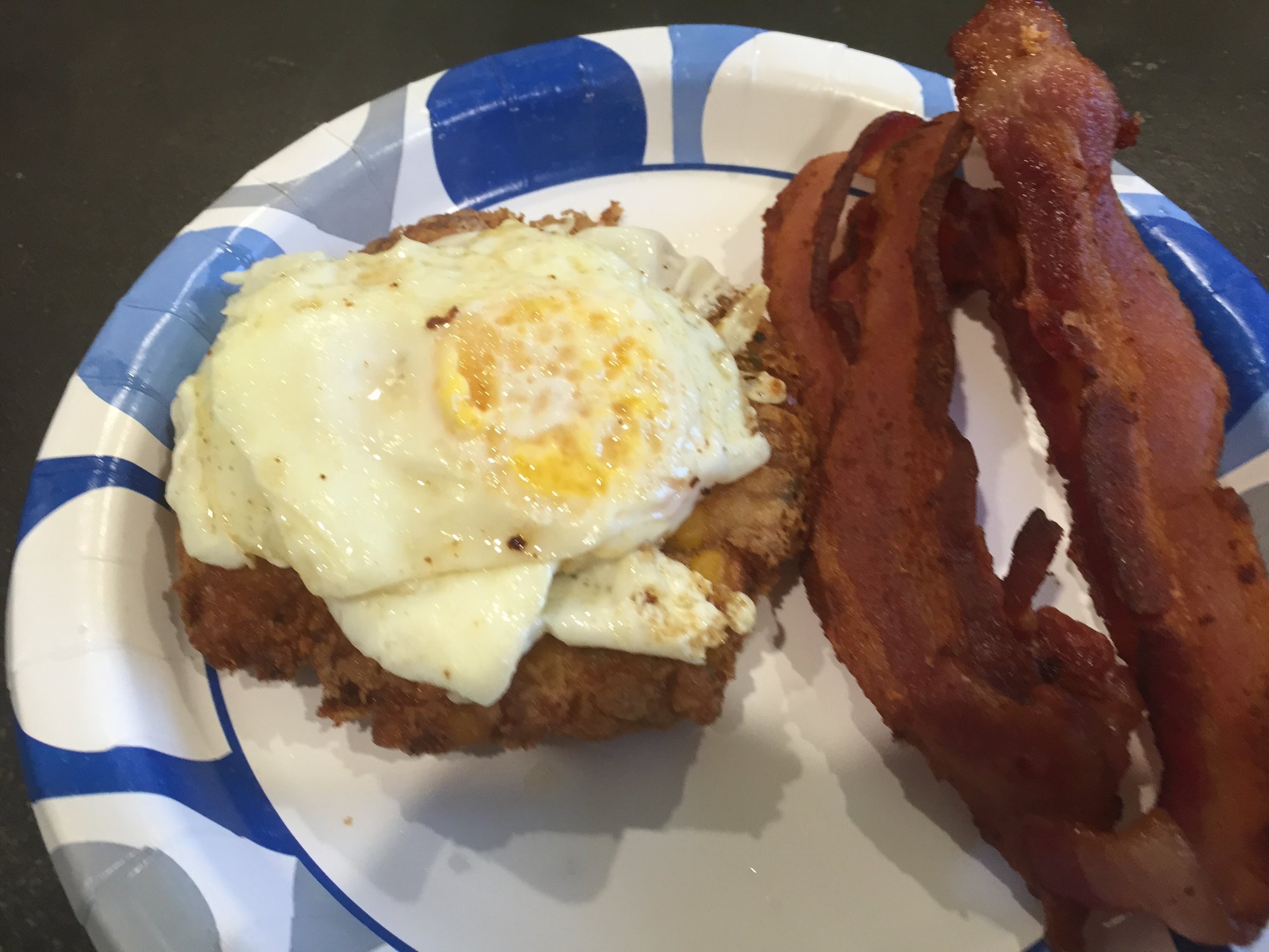 Leftovers, this morning I mashed some of the leftover potatoes with crawfish tails, onions, garlic, mushrooms, and corn from the boil in them. Smashed it into a patty, covered it in flour, and fried them. A side of bacon and 2 fried eggs on top, hangover helper.
