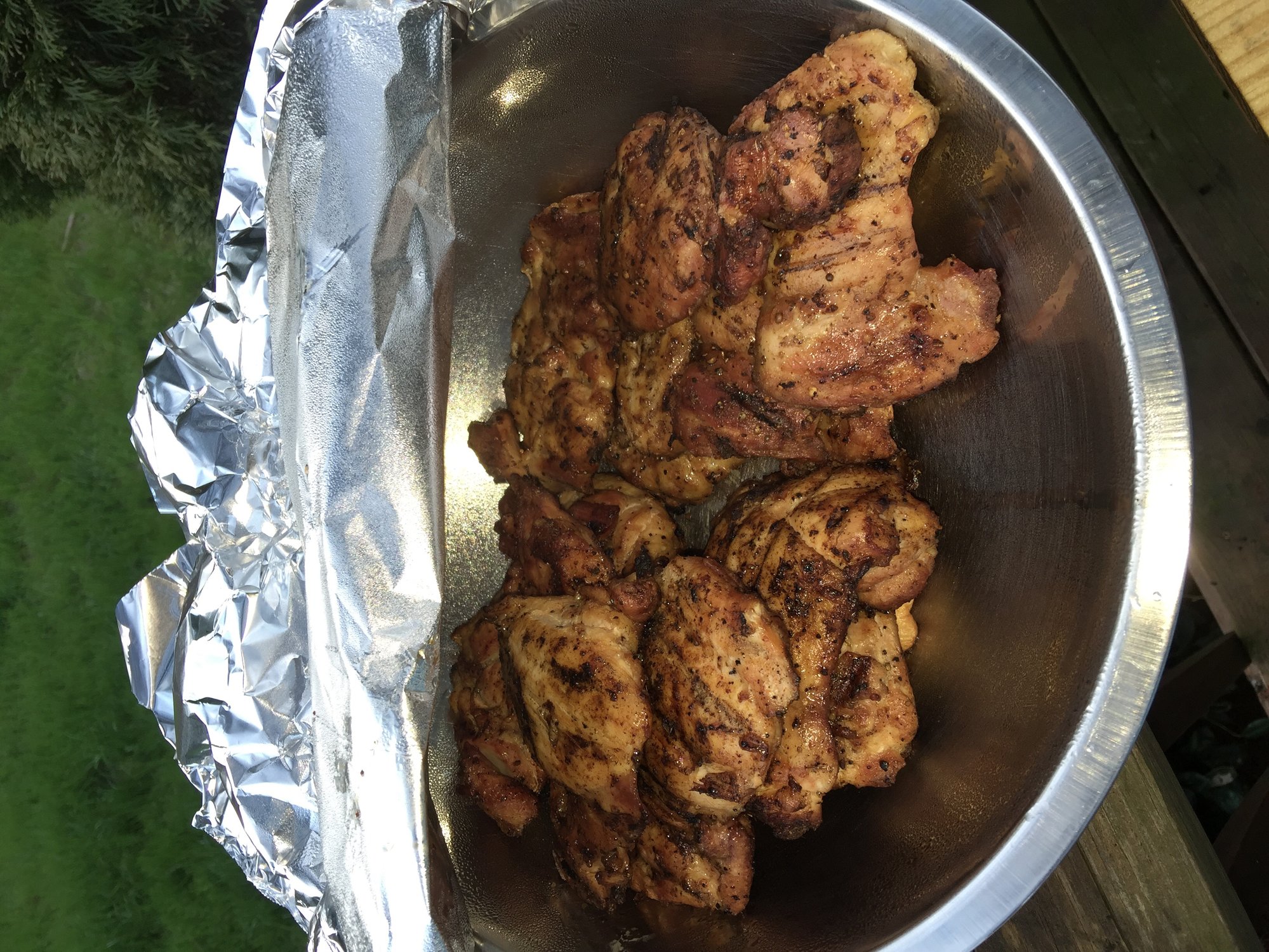 Went to The Butchers Market in Cary NC today to look for some dinner inspiration. Picked up some Dizzy Pig Redeye Express. Decided to try it on some Porterhouse Steaks and some chicken thighs. Steaks cooked direct flipping every 30 seconds to Medium Rare. Thighs cooked raised direct. Grilled asparagus marinated in Newmans Oil and Vinegar.