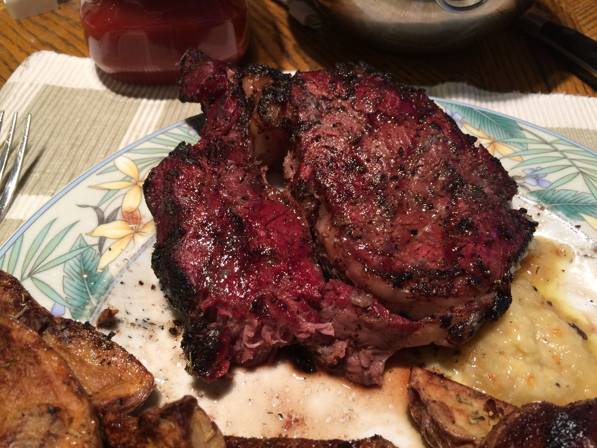 Correct, and although its raised direct, I always have spuds or corn on the lower rack, so its more of an indirect anyways. I don't pat dry though, maybe I should, but I just use course salt and pepper, a tiny bit of garlic powder (the wife likes it), I know patting it dry will give it a bit more sear, but I seem to get enough, and I dont want to pat any of the flavor off. And I dont wrap them, I just stick them on a plate in a warming drawer till the Egg is ready, doesn't take long.oldgeezeystax said:700 shooowee that's hot!