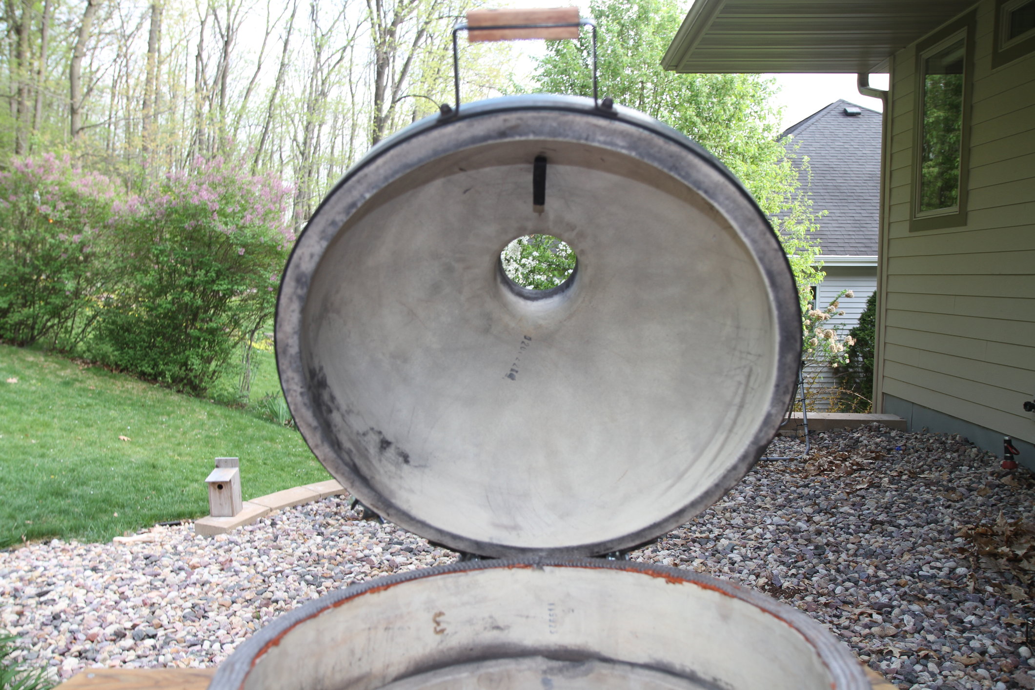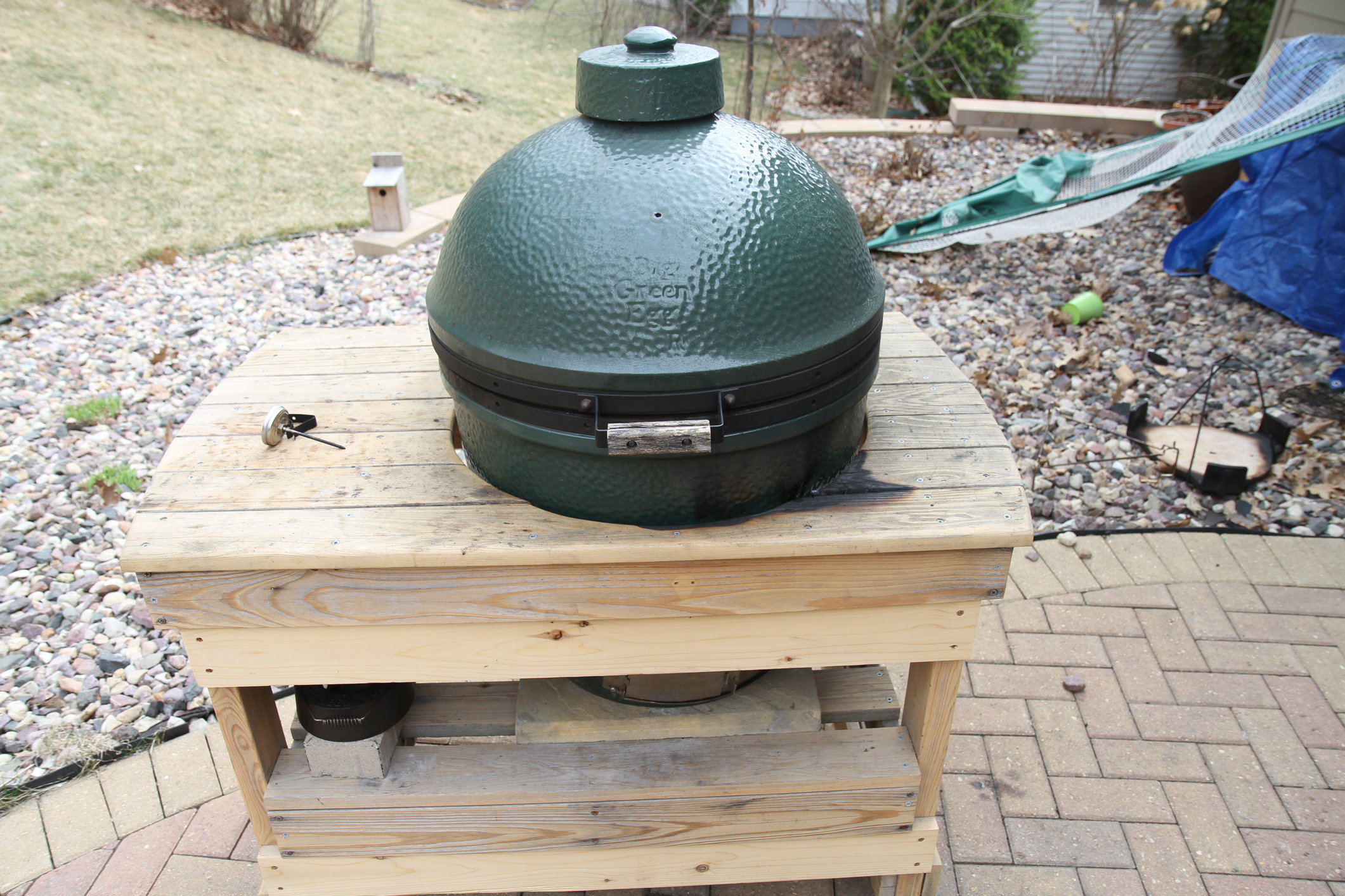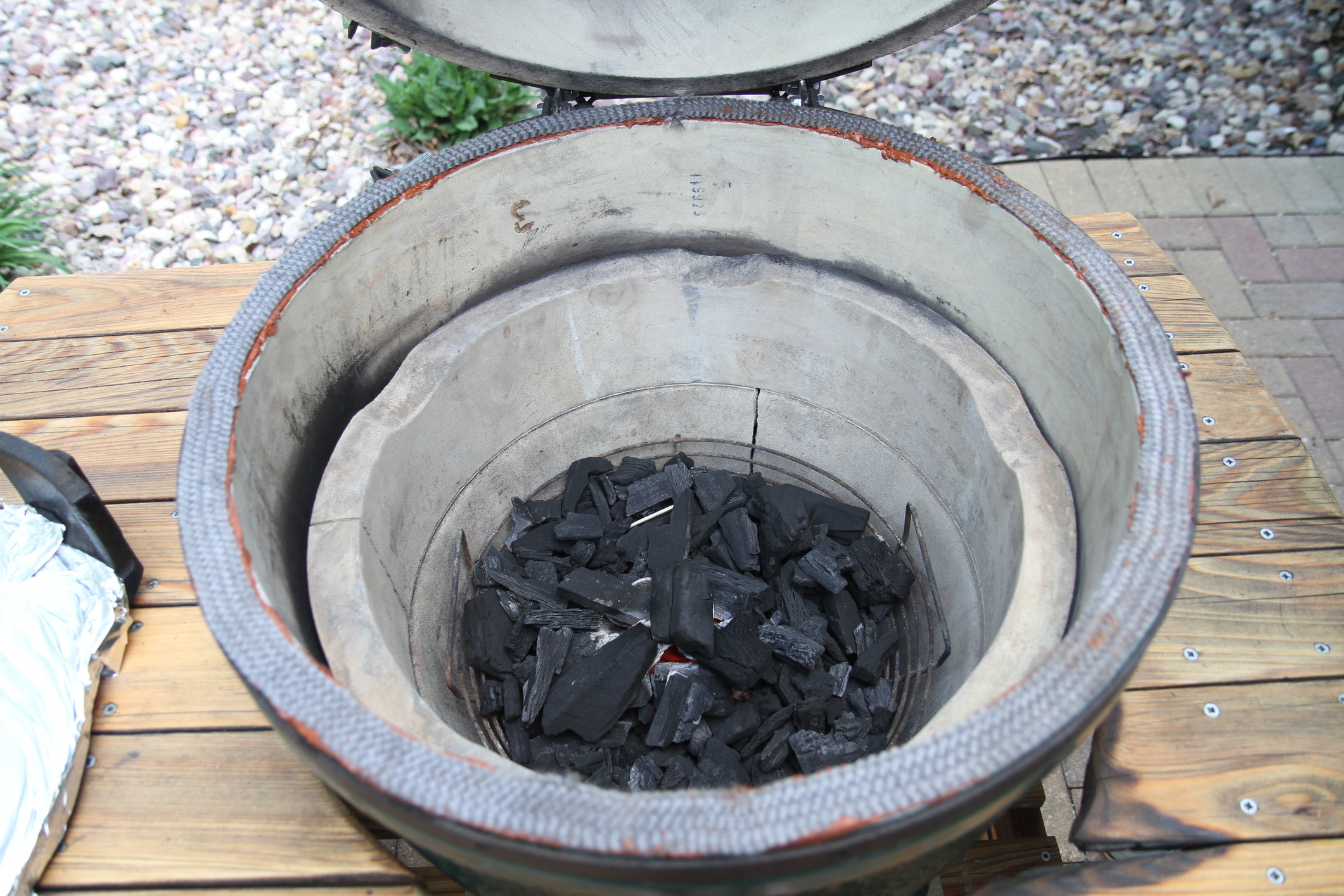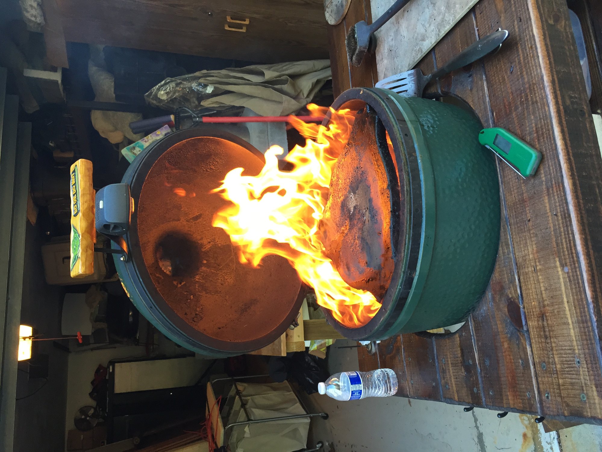 Not only is an air gap under egg an important thing never never leave egg unattended during clean burn.  Took the dog for a quick walk and found my table on fire when we got back.  Luckily not too much damage.  Just a reminder to all these things can get hot.  When I get time plan to tear egg down, look for cracks and replace gasket with Rutland.  Also will purchase egg nest for proper air gap.  Is there any place LBGE tends to crack?  I will inspect closely upon tear down but just wondering if anyone knows of any weak spots in the ceramics.  On the plus side thing is almost white inside top to bottom. One last question, was it a bad idea to pull the thermometer and let her run wide open with 3/4 of a fire box full?  How do others do clean burn?