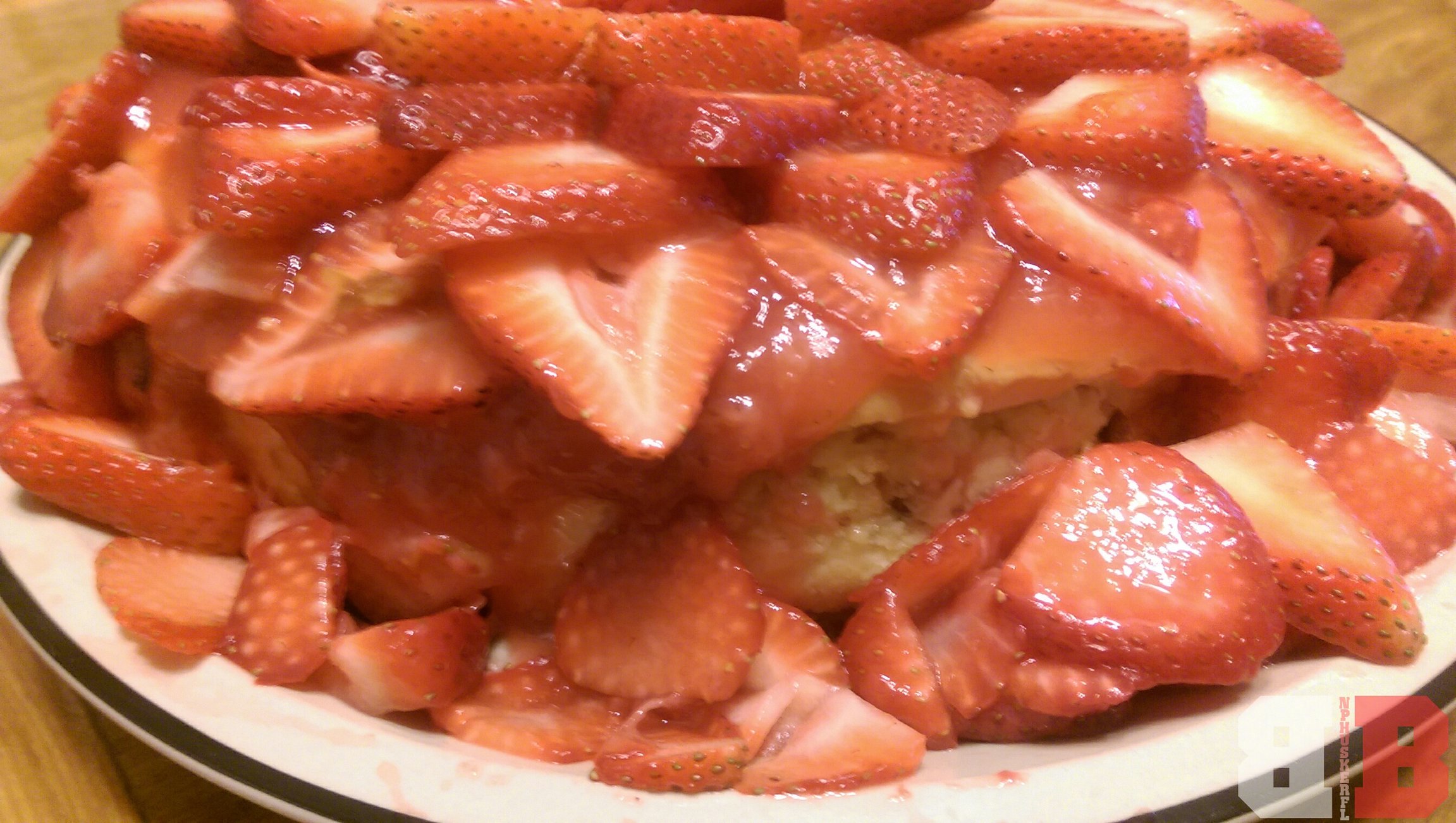 Here's a peek at my requested Homemade Birthday Strawberry Cheesecake for tomorrow. It's in the frig setting up.