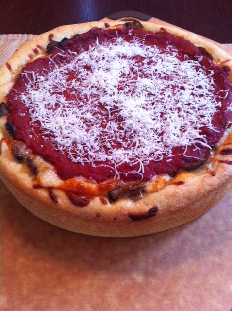 Actually decided against a cut through picture. Once it was cut due to the high moisture content of the mushrooms and spinach the sauce slid down over the cut edge onto the plate a bit and hid the edge not making for a nice picture. I sautéed both pretty heavy and drained the pan as well. I think next time I may blot with paper towel for added moisture reduction. The pizza did hold together other than that though. I usually put all the cheese in the bottom, then meat toppings, and then sauce but for this one I did 1/2 cheese, fillings, and then other 1/2 of cheese thinking it would hold together better.