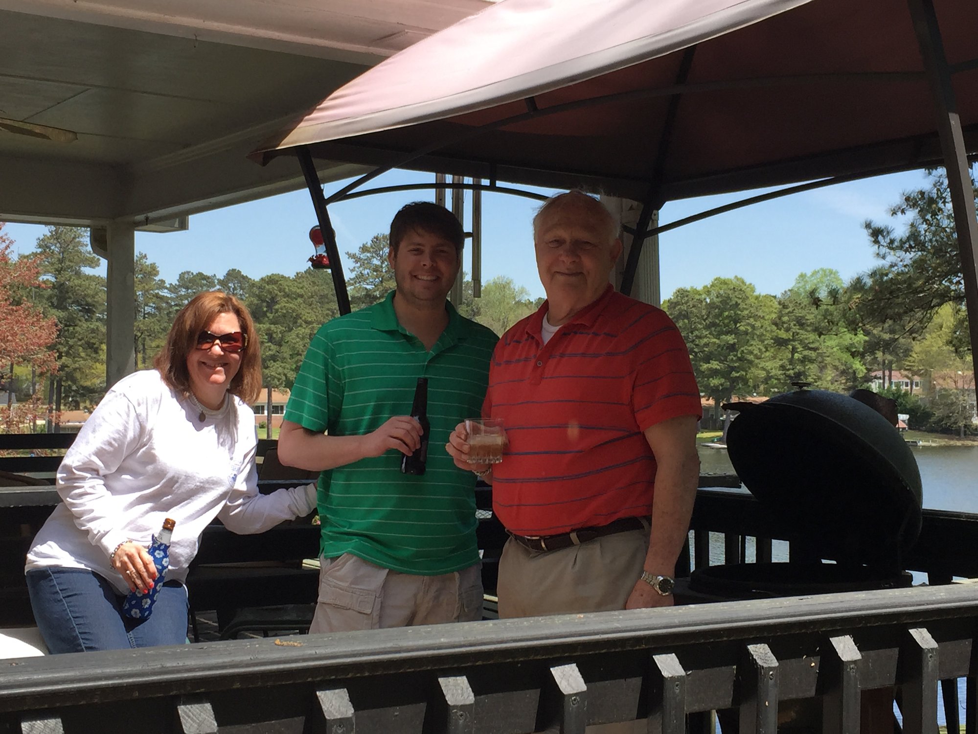 Here is a picture of my grandfather, my aunt and myself. You can barely see the egg to the side there. Rewind a little bit...I went to get parts from Bruce, BGE gave us an entire new lower half for the egg and new insides. Obviously my grandfather was very pleased!