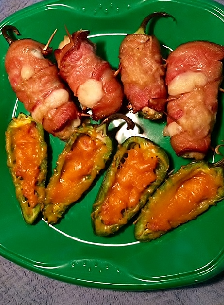 ABTs (with garlic cream cheese, shrimp, and Swiss cheese) along with 'stuffed' jalapeno peppers (with leftover Easter ham and sharp cheddar)