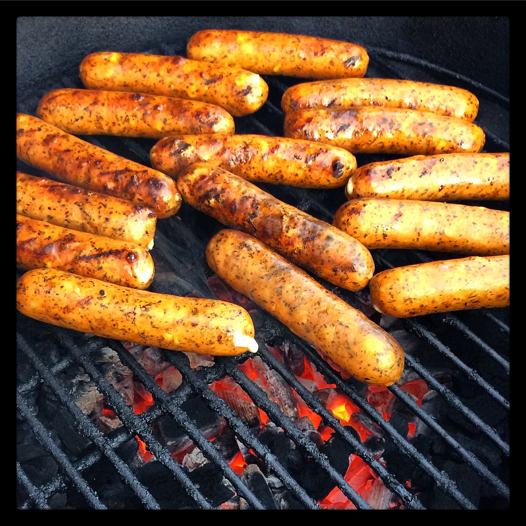 gotta love having the egg going for hours anywhere from 300 to 600 and cooking different stuff. Decided to do some chicken sausage I got at Sam's today. Sipping Titos after drinking about 2L of seltzer this afternoon.